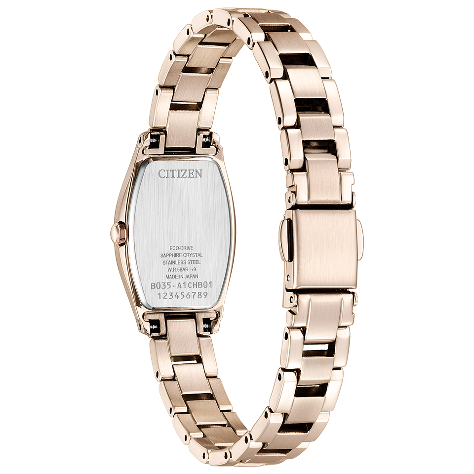 華やかなサクラカラーを纏った女性の腕元を知的に飾るエコ・ドライブモデルです。文字板には、サクラカラーのケースと調和するベージュカラーを選び、中央にはラメを施してさりげない艶感をプラス。控えめながらも上品な輝きが楽しめます。また、細長いリーフ形状の植字と軽やかなローマ数字のインデックスが、シンプルながらもクロスシーらしい個性を感じさせるデザインです。毎日使いたくなる、飽きのこない魅力的な一本です。
