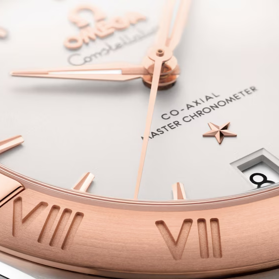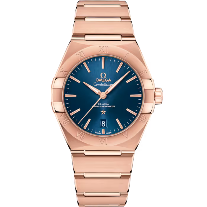 この39 mmの18Kセドナ™ ゴールド製モデルは、ローマ数字が刻印されたベゼルが印象的で、サンブラッシュ仕上げのブルーのダイアルには、6時位置に日付窓があります。針、オメガロゴ、コンステレーションの「星」、インデックスにはいずれも18Kセドナ™ ゴールドが使用されています。