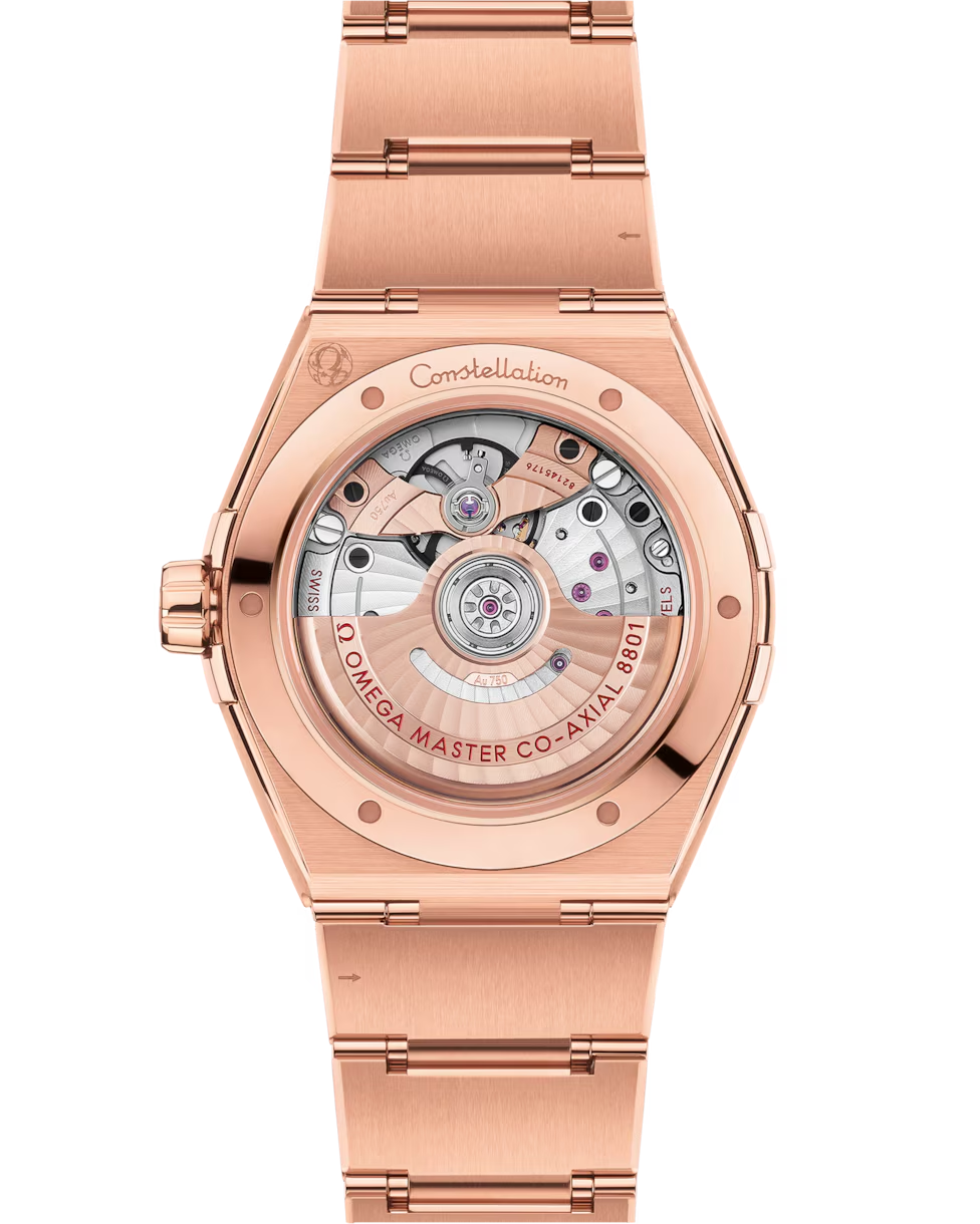 オメガ コーアクシャル マスター クロノメーター キャリバー 8801が搭載されており、傷のつきにくいドーム型サファイアクリスタルガラスから眺めることができます。