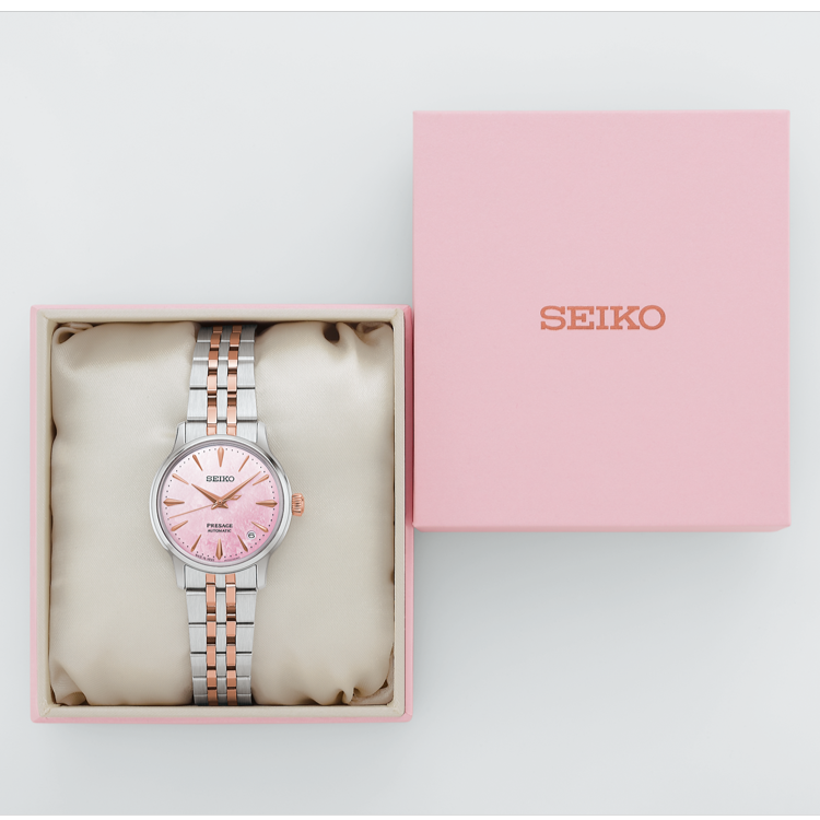 ピンクゴールドカラーの針、インデックス、りゅうずとツートーンカラーのブレスレットを採用し、モデル全体で華やかな桜の季節を感じさせます。