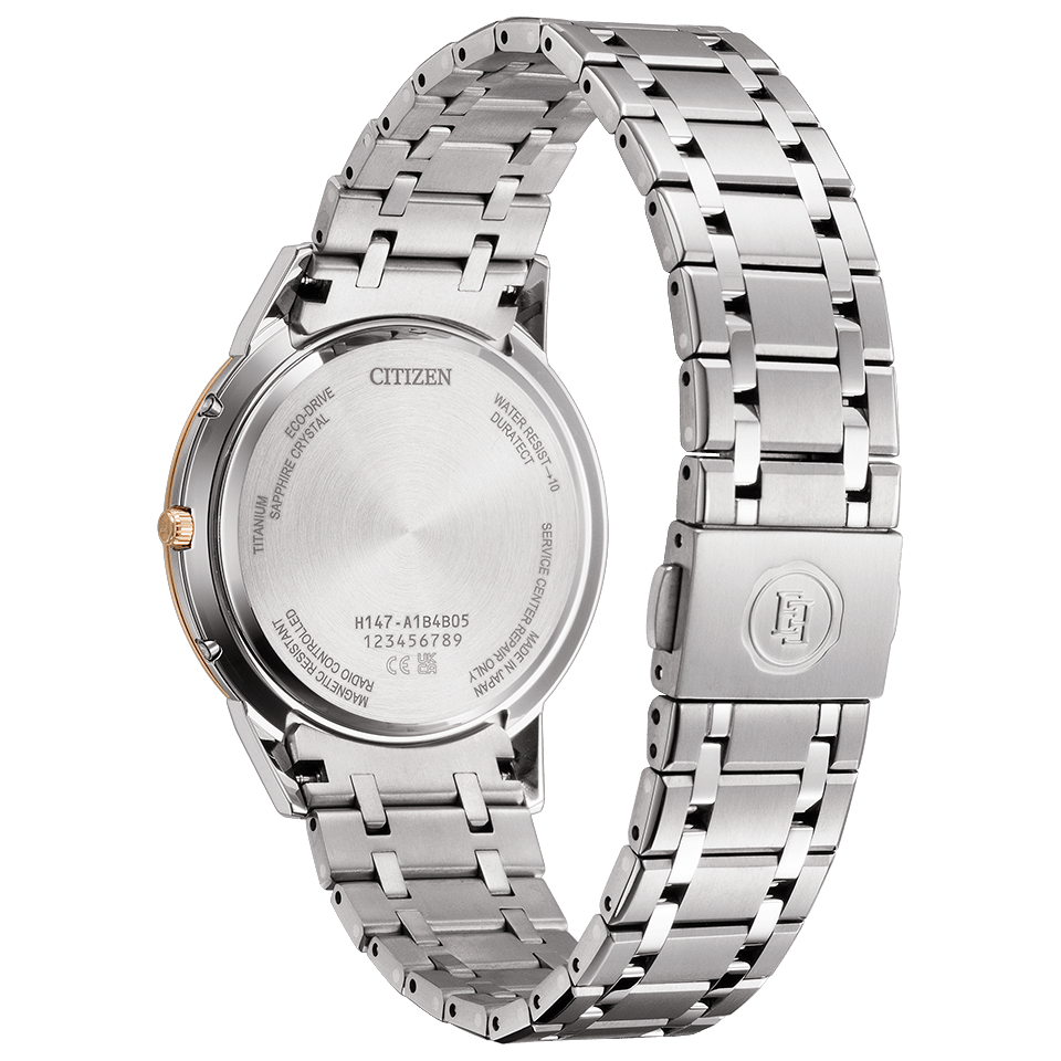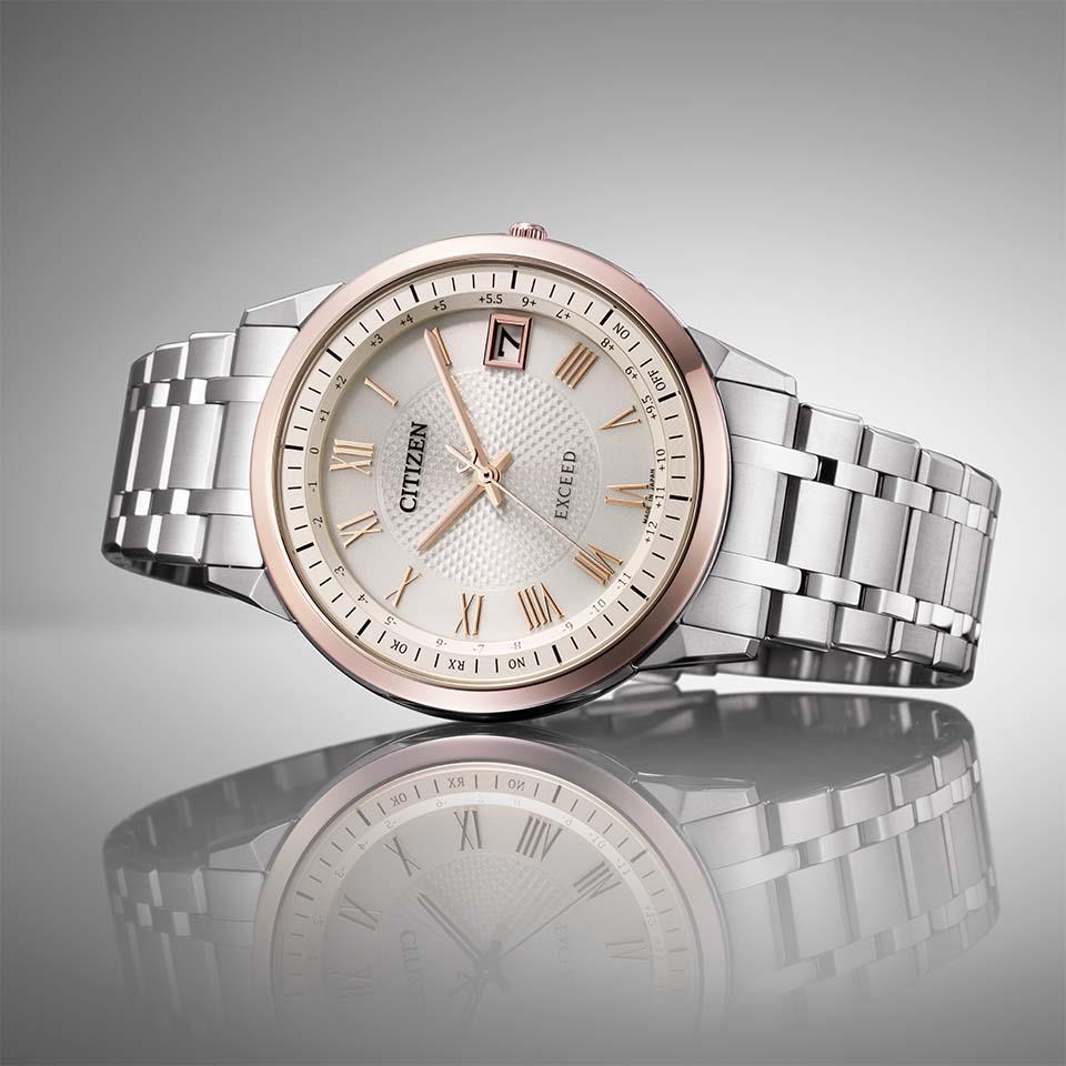 日中米欧4エリアで受信可能な多局受信型エコ・ドライブ電波時計としてケース総厚7.0mm(設計値)を実現。上品で柔らかな印象がきわだつベージュ色の文字板を採用。中央にあしらったピラミッドパターンがクラシカルな表情を演出します。透明感のあるライトシルバー色のケースとバンド、サクラ色のベゼルを合わせたツートーン仕様がエレガントな雰囲気を引き立てます。