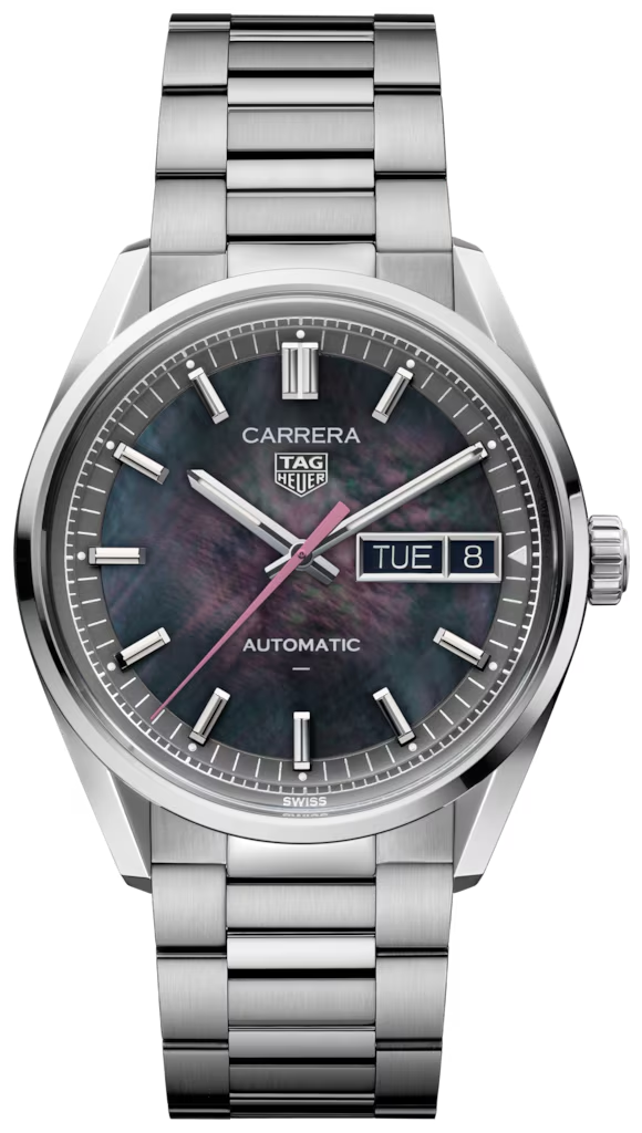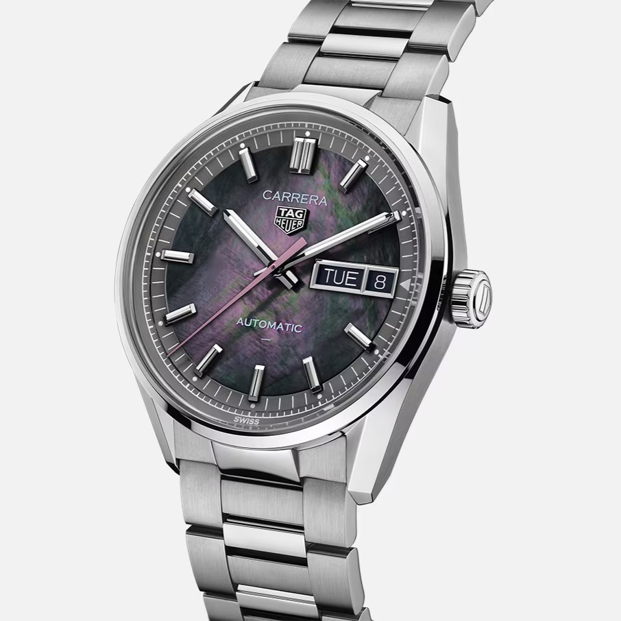桜から着想を得た日本限定モデル タグ・ホイヤー カレラ デイデイト ジャパン リミテッドエディション。ブラックマザーオブパール(黒蝶貝) のダイヤルは光の加減や見る角度によって幻想的な輝きを放ち、ピンクの秒針をポイントとしてあしらっています。41mmと36mmの2サイズで展開している2つのモデルはペアウォッチとしてお使いいただくのもおすすめです。41mmモデルは200本のリミテッドエディションです。