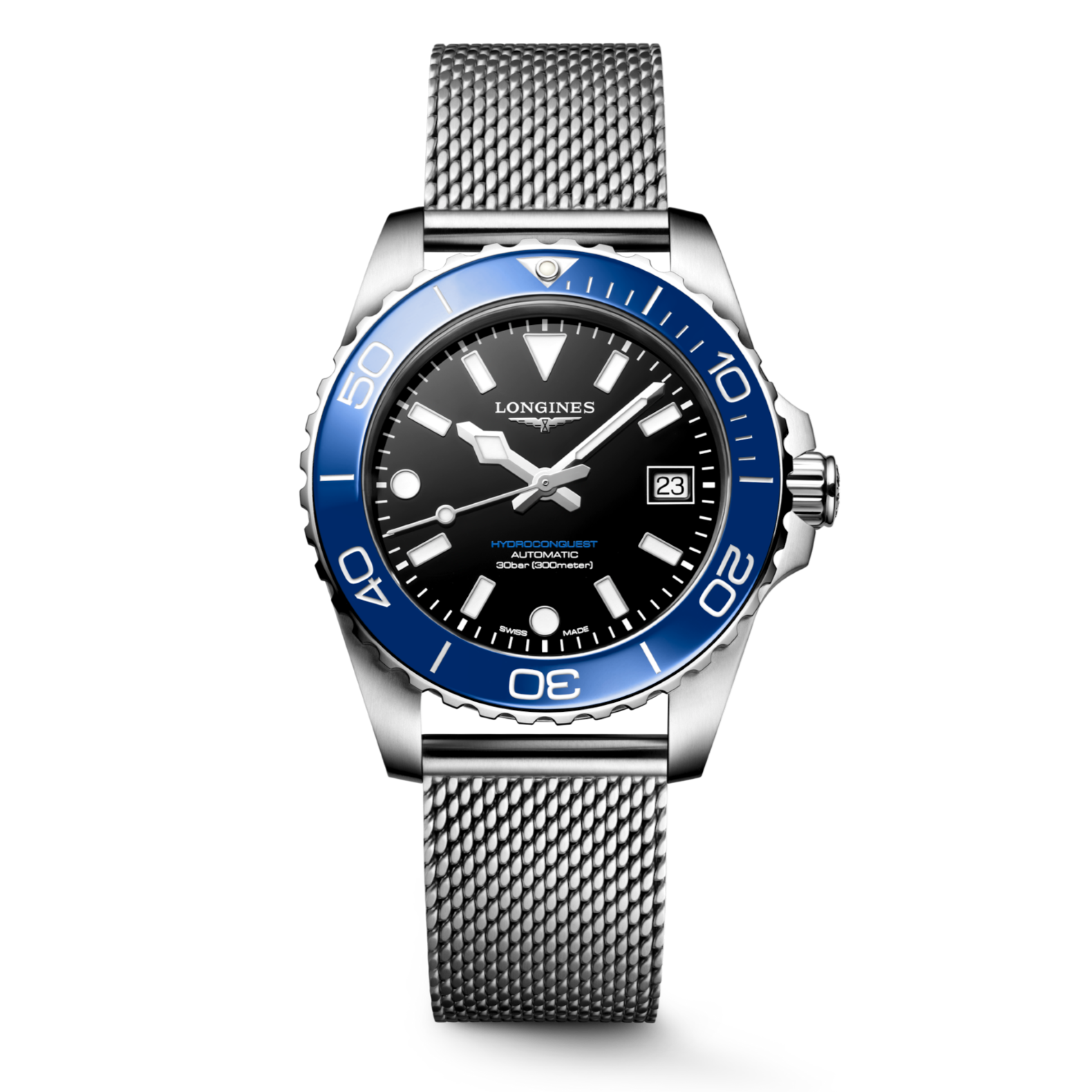 モダンな美しさと確かな性能が融合した「ハイドロ コンクエスト」コレクション ロンジン独自の自動巻きキャリバーを搭載し、30気圧(300m)の防水性能、逆回転防止ベゼル、ねじ込み式リューズ、ねじ込み式ケースバックを採用。