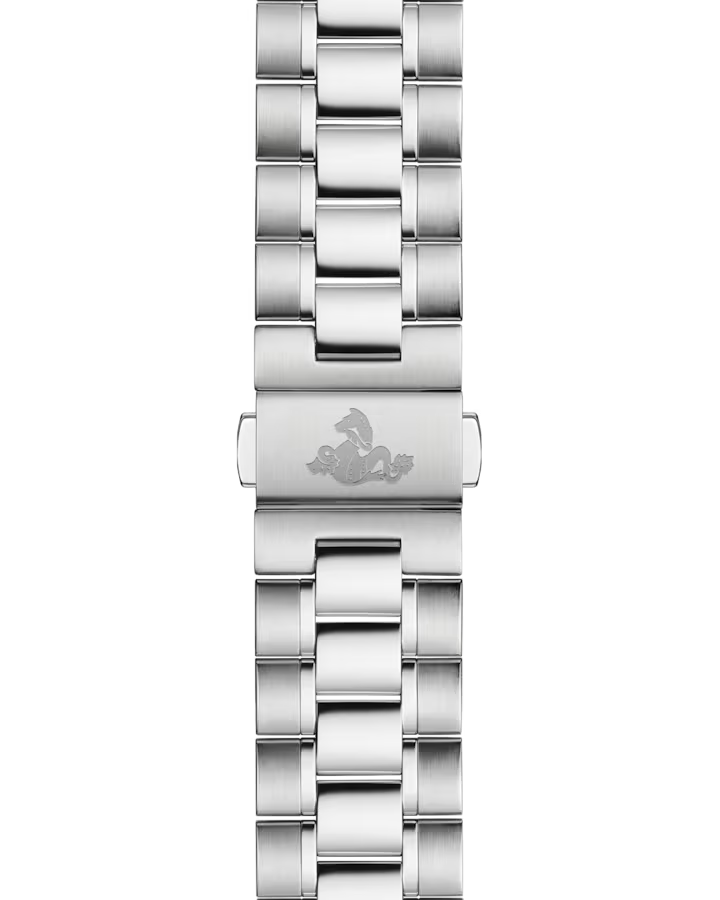 このモデルの特徴は、ステンレススティール製ケースと、グレーのアルミニウム製リングにタキメータースケールを搭載したベゼルです。