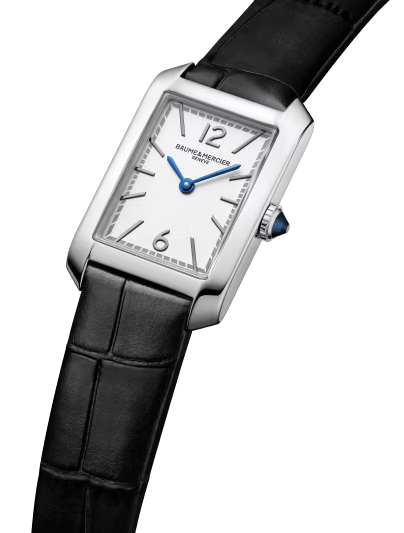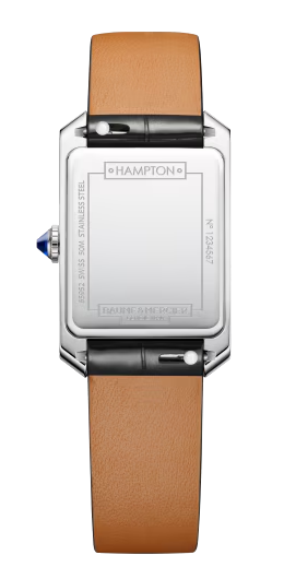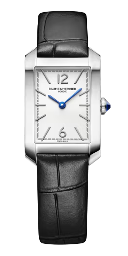 ハンプトン10795はシルバーホワイトのオパーリン文字盤に、ロジウム仕上げリベット留めのアラビア数字とインデックス、ブルーの剣型針があしらわれています。ポリッシュ仕上げのステンレススティール製長方形ケースには、ブルーの人工スピネルを嵌め込んだスティール製カボション型リューズがついています。交換可能なアリゲーター柄のブラックレザー ストラップは、工具なしで交換できる信頼性の高いシステムを備えています。
