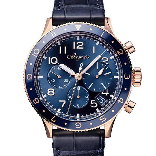 仕様:時・分・日付表示、スモールセコンド、フライバック・クロノグラフ、15分積算計、12時間積算計、ゴールド製ベゼル、ブルーセラミック製リング、サンバースト仕上げのブルー文字盤