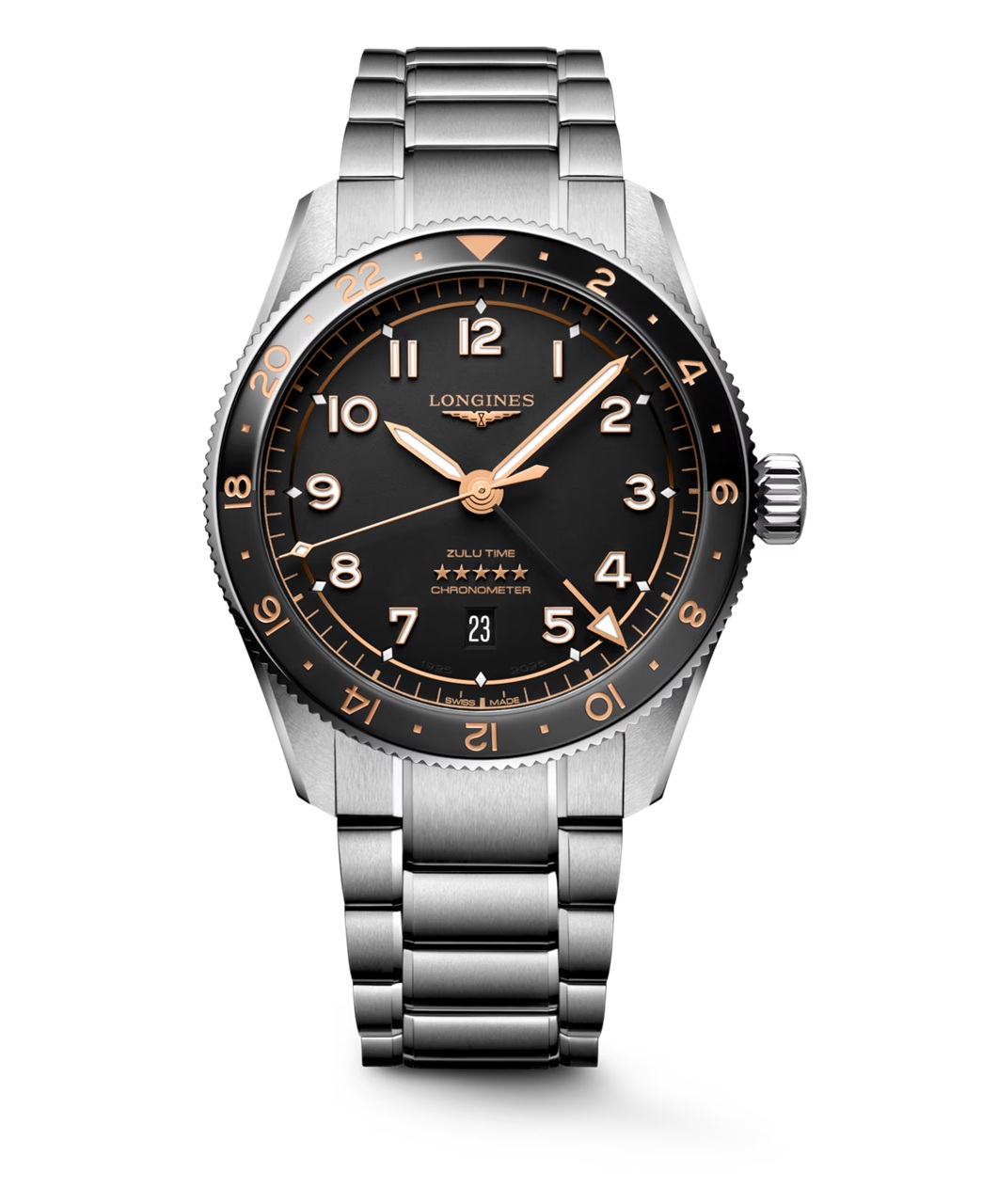 複数のタイムゾーンを備えたタイムピースに関する、100年におよぶブランドの専門技術を体現する「ロンジン スピリット Zulu Time」。その起源と名前は、1925年に製造されたロンジン初の第二時間帯表示の腕時計に由来しています。文字盤にZulu Timeを示すZフラッグが施されており、「Z」の文字は航空で使用されている協定世界時を意味しています。「ロンジン スピリット Zulu Time」は、細部にまでこだわり抜かれた仕上げにより、その美しいデザイン性の面でも際立ちます。両方向回転ベゼルに備えられているのは、セラミック製のインサート。各モデルは、磁場からの影響を受けにくいシリコン製ヒゲゼンマイを備えたロンジン独自のキャリバーを搭載し、COSCによるクロノメーター認定を受けています。