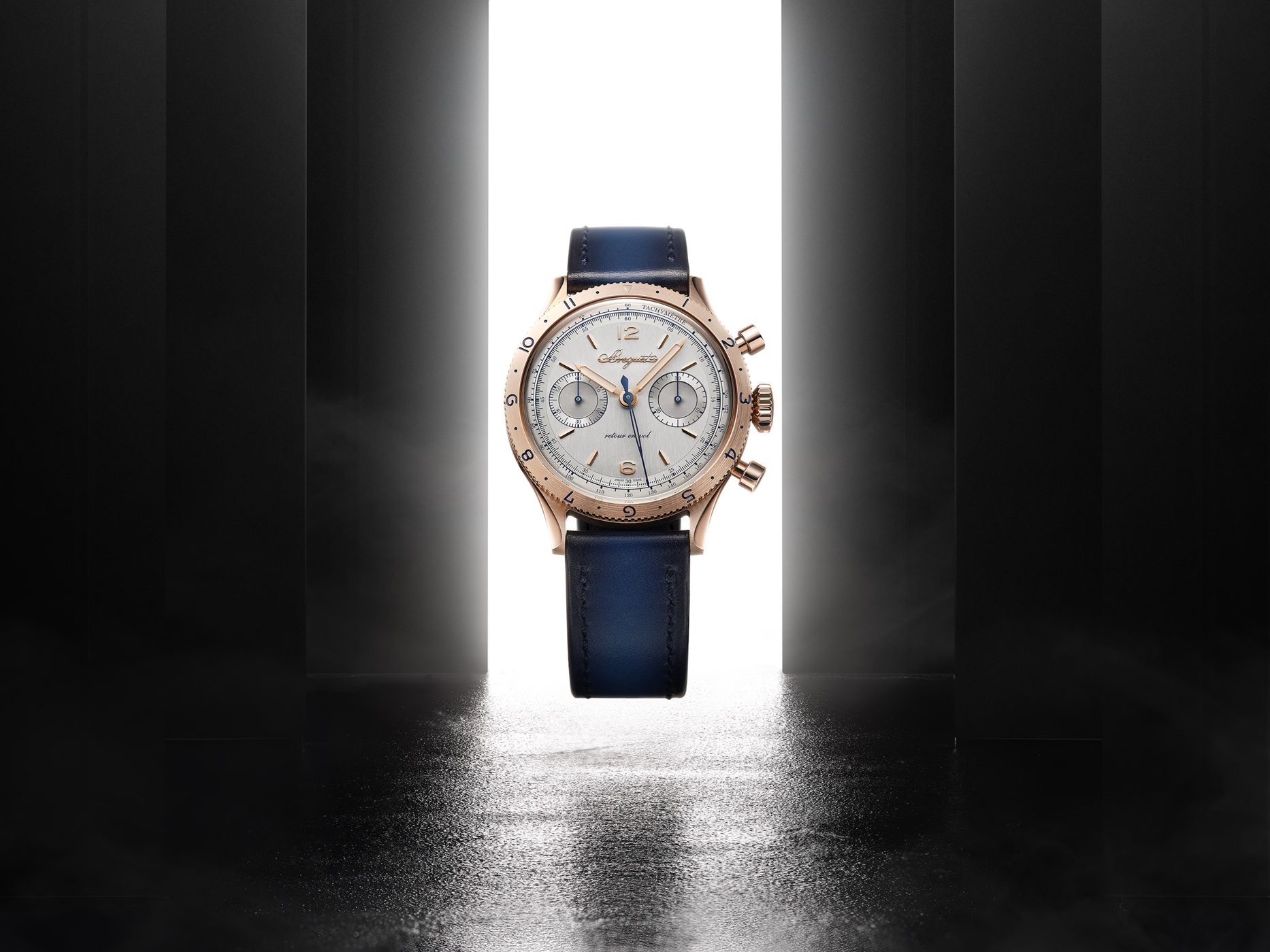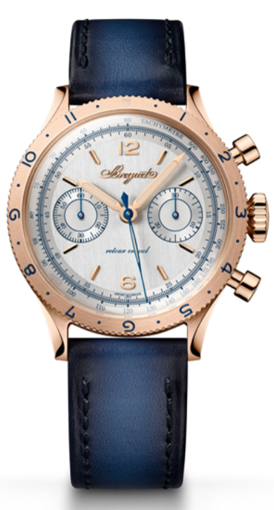「フライバック」機能を装備したこちらのクロノグラフは、人間の英知と時代を切り開く勇気を讃えて、3 つの人々に敬意を表しています。すなわち、メゾンの創設者でブランドの名にもなった時計師アブラアン-ルイ・ブレゲ、その5代目の子孫で航空機の製造者ルイ-シャルル・ブレゲ、そして2人組の飛行士デュドネ・コスタとモーリス・ベロンです。彼らは、1930年9月1日から2日にかけて、ブレゲ 19TF スーパービドンに搭乗してパリからニューヨークを空で結んだ、まさしく最初の人物でした。スーパービドンという名は大容量の燃料タンクに由来し、その機体の両側には大きなクエスチョンマークが描かれていました。