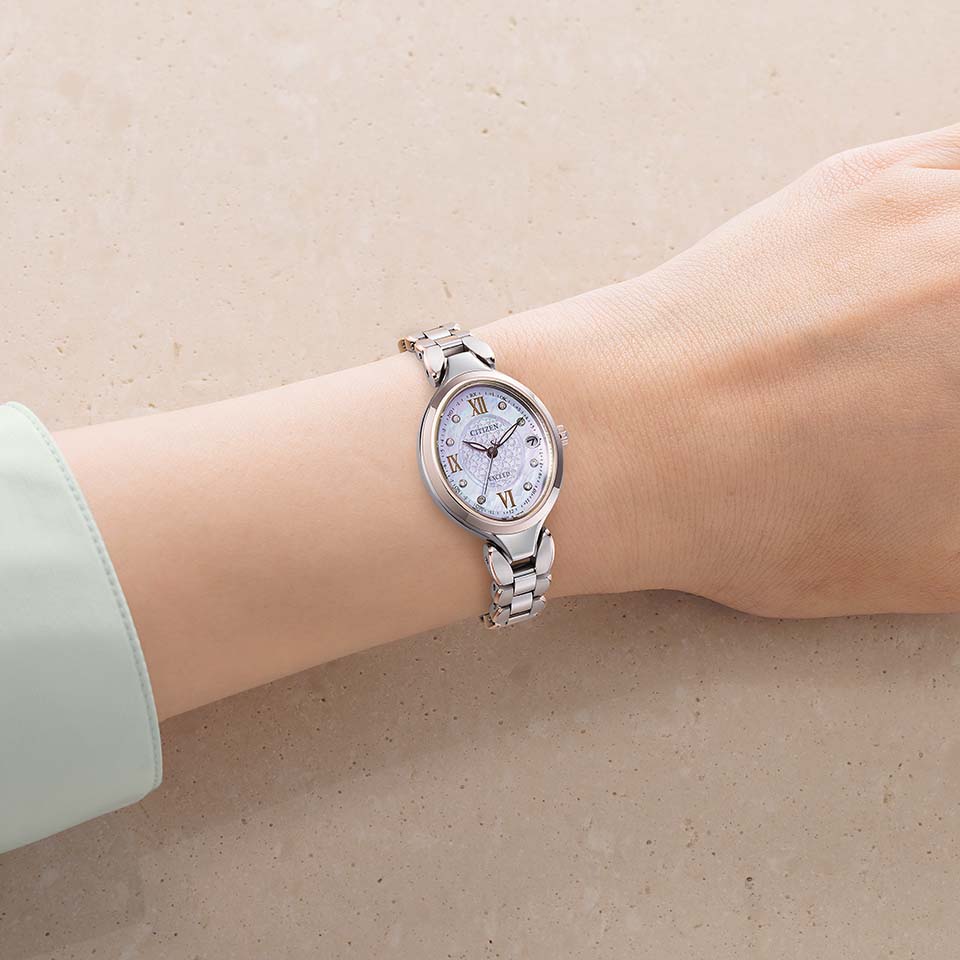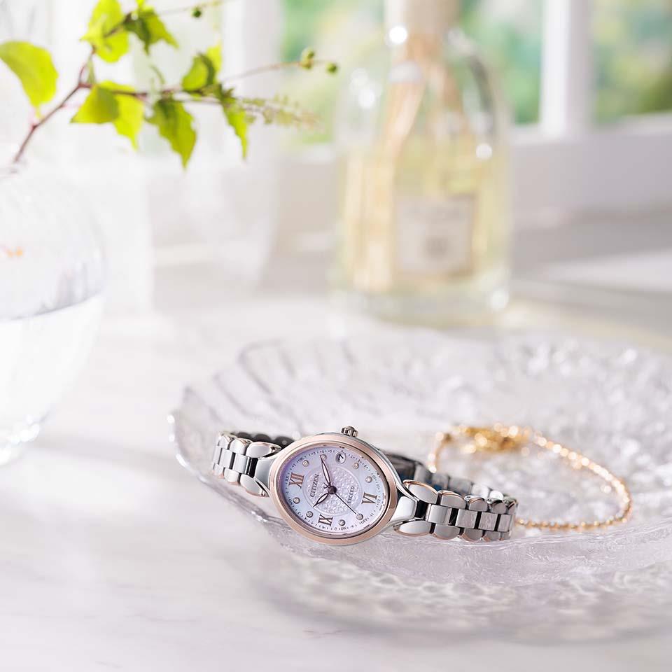 お花をモチーフにしたバンドのデザインが人気のシリーズ。バンドから繋がるようなケースラインがエレガントな印象を演出します。オーバルケースは視認性を確保しながら、着け心地にこだわったサイズ感を実現しました。