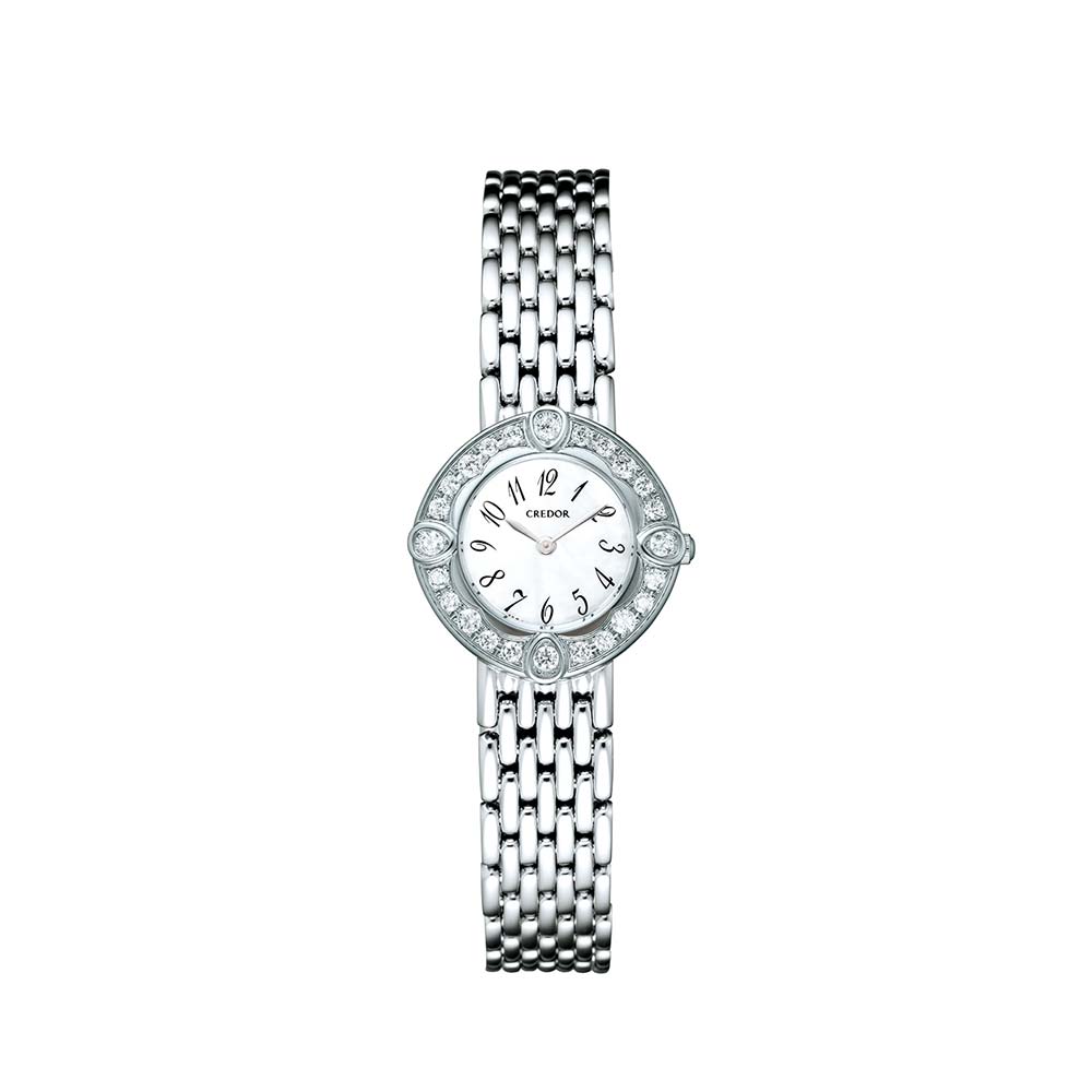 白蝶貝のダイヤルにエレガントなアラビア数字を優雅にレイアウトしたモデルです。