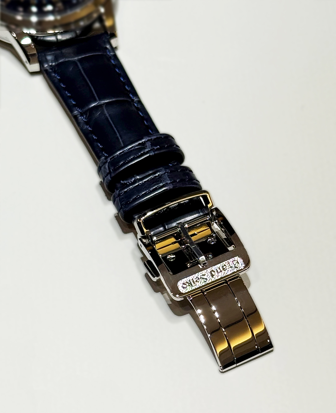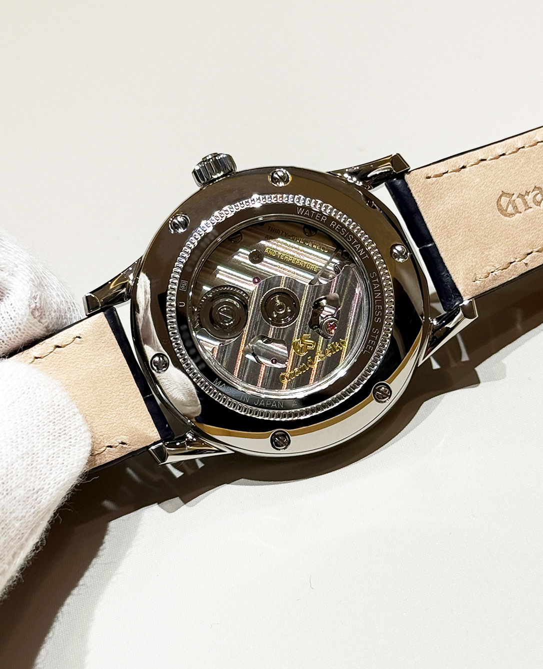 ケースはステンレススチール製で、39.5mmという程よいサイズ感とクラシカルなプロポーションが特徴。ラグやケースラインの磨き上げはグランドセイコーならではの美しい陰影を生み、手元の所作をより優雅に見せてくれます。