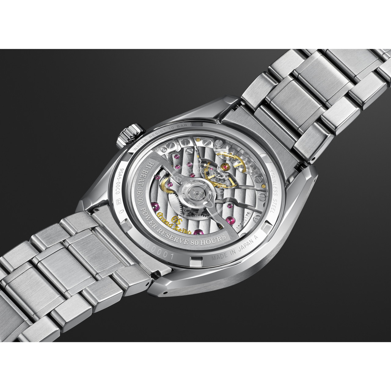 SLGH005には、メカニカルハイビートムーブメント「キャリバー9SA5」が搭載され、独自のデュアルインパルス脱進機やツインバレルを採用することで、毎時36,000振動というハイビートを実現しつつ、最大80時間の駆動時間を誇ります。また、水平輪列構造により薄型化を実現し、技術とデザインが融合したグランドセイコーの傑作といえます。