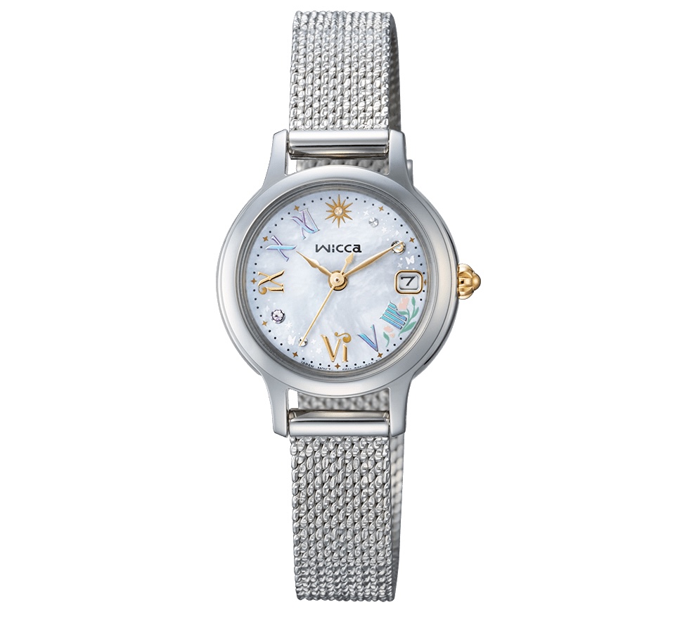 白蝶貝文字板にお花や蝶をちりばめ、インデックスは「グリンダ」の女性らしい仕草やカールした髪、魔法の杖をイメージしてデザイン。