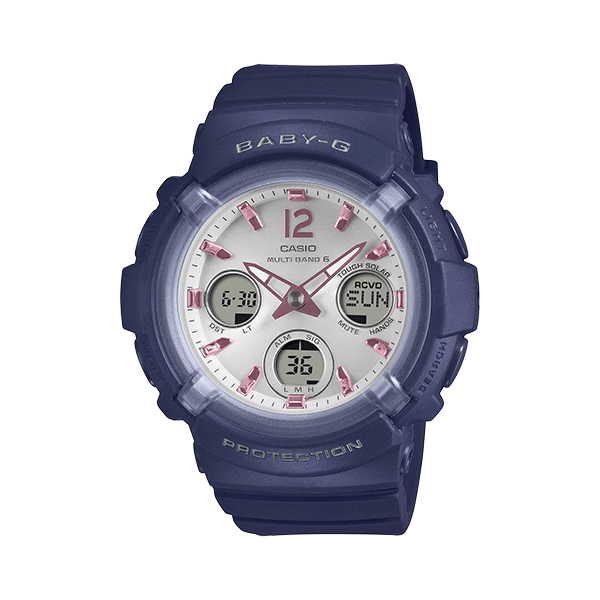 キュートな印象ながらボリューム感のあるフォルムでスポーティさを演出。機能面では、耐衝撃構造や10気圧防水、世界6局の電波を受信し時刻を自動修正するマルチバンド6、ワールドタイム、タフソーラー等、頼れる機能を備えています。