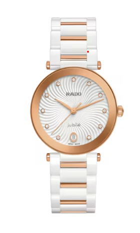 LaCoupole(ラ・クポール)は、歴代のアイコンたちに敬意を捧げると同時に、現代の洗練された感性にふさわしく再解釈されたタイムピースです。これは、ラドーだけが提供できる精度と革新による設計と、洗練された魅力を表現しています。 31mmのポリッシュ仕上げのホワイトハイテクセラミック製モノブロックケースは、ローズゴールドカラーのメタリックの縁取りが際立つドーム型のサファイアクリスタルで飾られています。ケースは5気圧(50m)の防水性を備え、日常使いに適した耐久性と不朽のエレガンスを兼ね備えています。そのシルエットは、まさにラドーを象徴するもの——しなやかで彫刻的、そしてタイムレスな美しさを湛えています。 シルバーのダイヤルには、ラッカーで仕上げた波状の装飾が施され、贅沢な立体感を生み出しています。11個のトップウェッセルトン フルカット ダイヤモンドがインデックスとして配置され、ダイヤルに静かな輝きをもたらし、6時位置の日付表示窓が、洗練された機能性を提供します。 その心臓部には、8石を使用したクオーツムーブメントR218を搭載。PreciDrive™テクノロジーにより、極めて高い精度を実現しています。 ケースを固定するのは、ポリッシュ仕上げのホワイトハイテクセラミック製ブレスレット。ローズゴールドPVD加工のパーツとクラスプが美しく調和し、全体のデザインを完成させます。LaCoupole(ラクポール)は、優雅さの象徴。人々の憧れをかき立て、永く寄り添うために創られたタイムピースです。