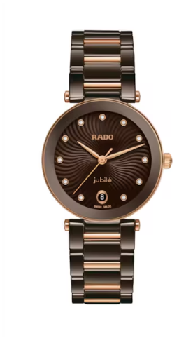 LaCoupole(ラ・クポール)は、歴代のアイコンたちに敬意を捧げると同時に、現代の洗練された感性にふさわしく再解釈されたタイムピースです。これは、ラドーだけが提供できる精度と革新による設計と、洗練された魅力を表現しています。 31mmのポリッシュ仕上げのホワイトハイテクセラミック製モノブロックケースは、ローズゴールドカラーのメタリックの縁取りが際立つドーム型のサファイアクリスタルで飾られています。ケースは5気圧(50m)の防水性を備え、日常使いに適した耐久性と不朽のエレガンスを兼ね備えています。そのシルエットは、まさにラドーを象徴するもの——しなやかで彫刻的、そしてタイムレスな美しさを湛えています。 シルバーのダイヤルには、ラッカーで仕上げた波状の装飾が施され、贅沢な立体感を生み出しています。11個のトップウェッセルトン フルカット ダイヤモンドがインデックスとして配置され、ダイヤルに静かな輝きをもたらし、6時位置の日付表示窓が、洗練された機能性を提供します。 その心臓部には、8石を使用したクオーツムーブメントR218を搭載。PreciDrive™テクノロジーにより、極めて高い精度を実現しています。 ケースを固定するのは、ポリッシュ仕上げのホワイトハイテクセラミック製ブレスレット。ローズゴールドPVD加工のパーツとクラスプが美しく調和し、全体のデザインを完成させます。LaCoupole(ラクポール)は、優雅さの象徴。人々の憧れをかき立て、永く寄り添うために創られたタイムピースです。