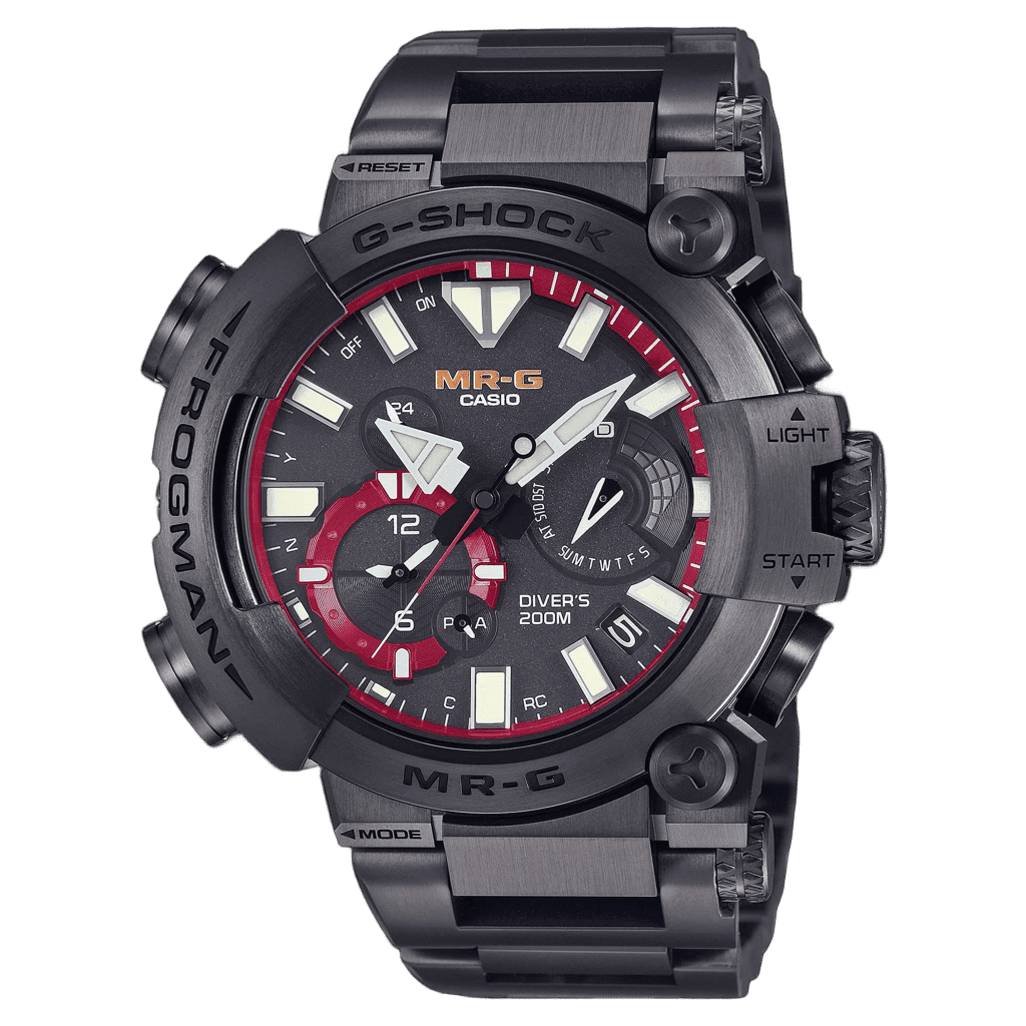 MRG-BF1000は、ISO規格200m潜水用防水機能を持つ本格ダイバーズウオッチ「FROGMAN」にチタン外装を採用し、丹念な仕上げを施したMR-Gです。