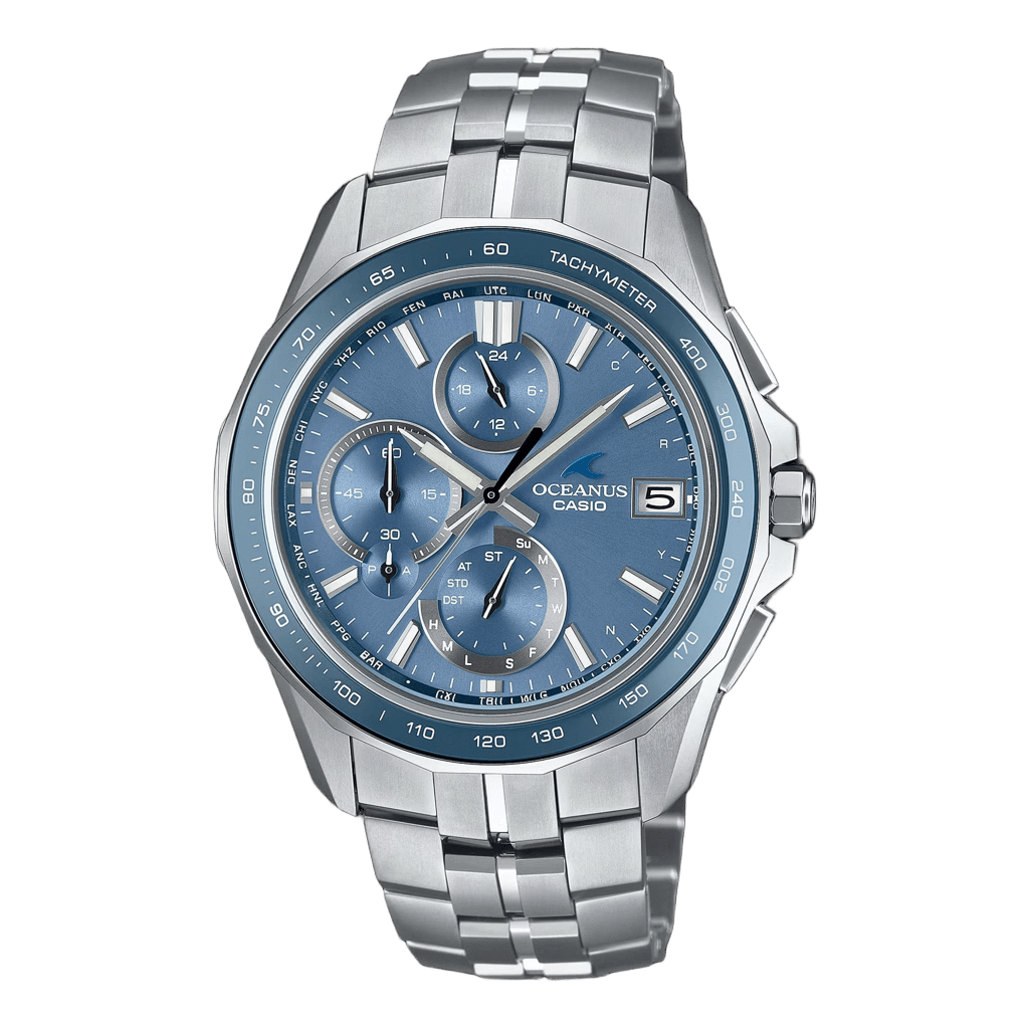 上質なスリムスタイルMantaのOCW-S7000E-2AJFはOCW-S40-2AJFとのペアで着けることを想定し、ライトブルーを採用。ベゼルにはライトブルー蒸着を施したサファイアガラスリング、文字板にもライトブルー蒸着を施しています。