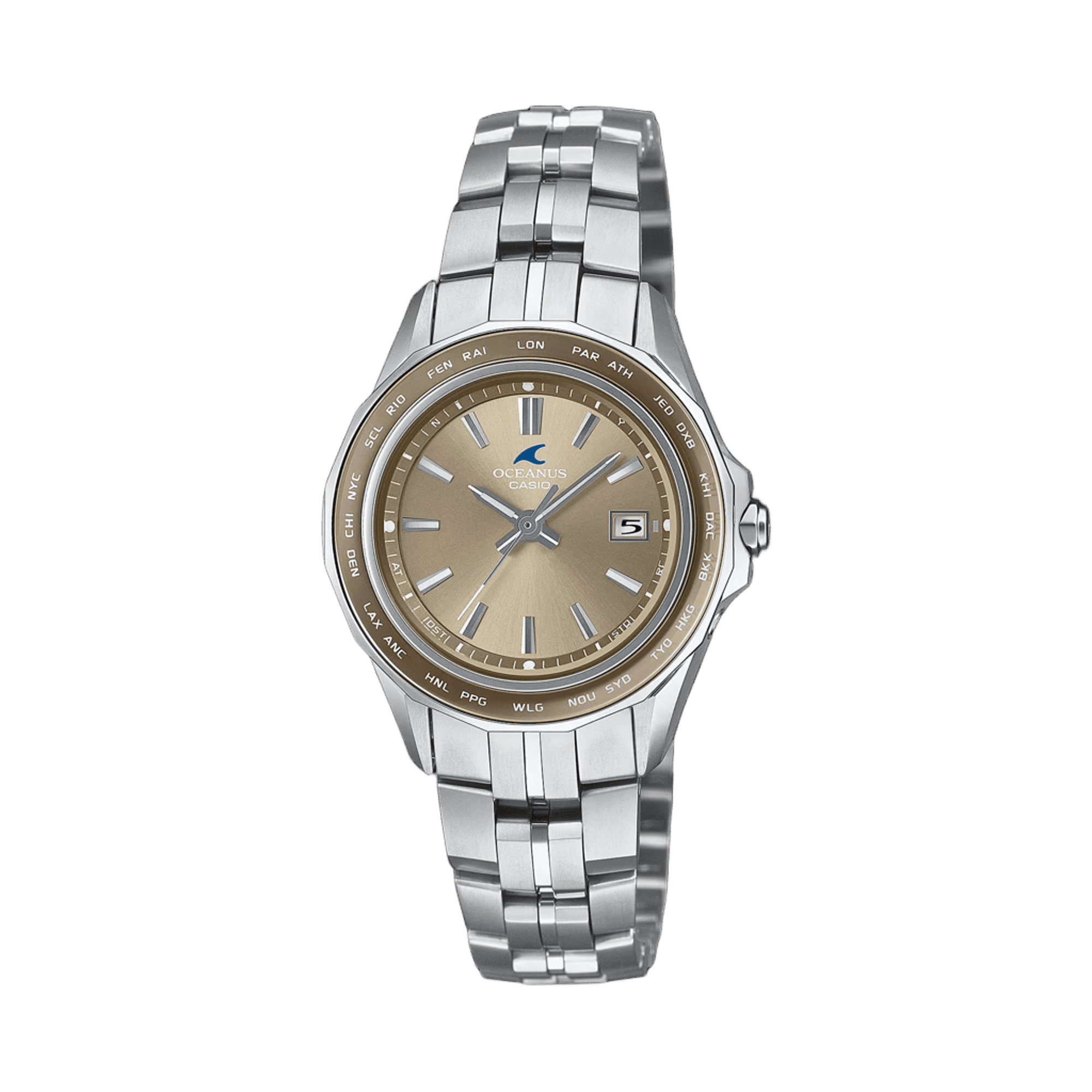 上質なスリムスタイルManta OCW-S40-5AJFはOCW-S400A-5AJFとのペアモデルで、ペールベージュをOCEANUSで初めて採用しました。ベゼル上のサファイアガラスリングと文字板にペールベージュ蒸着を施した電波ソーラーモデルです。