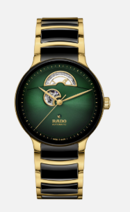 ラドーCentrix Automatic Open Heartで、イノベーションと美の完璧な調和を楽しみましょう。 この傑作の心臓部には、ラドーのキャリバーR734自動巻ムーブメントが搭載され、抜群の高い精度と信頼性を生み出しています。80時間パワーリザーブ機能なので、長時間連続して高いパフォーマンスを発揮し、耐磁性ニバクロン™ひげぜんまいと5ポジションでの調整により、さらに精度が向上しています。上品な39.5 mm径のポリッシュ仕上げイエローゴールドカラーのステンレススチール製ケースに収まったCentrix Automatic Open Heartは精巧な職人芸を示しています。サファイアクリスタルを備えたポリッシュ仕上げステンレススチール製ケースバックからは、時計内部の魅惑的な仕組みが覗き込めるようになっています。そしてダイアルには、うっとりするようなグリーンからブラックへのグラデーションが施されていて、時計のデザインに深みと魅力を付け加えています。イエローゴールドカラーの針で引き立つダイアルは、素晴らしい視認性を実現するとともに、エレガントさをもたらしています。ブレスレットは、ポリッシュ仕上げイエローゴールドカラーのステンレススチールとブラック ハイテクセラミックスの中央リンクが特徴で、強烈なコントラストを生み出しています。