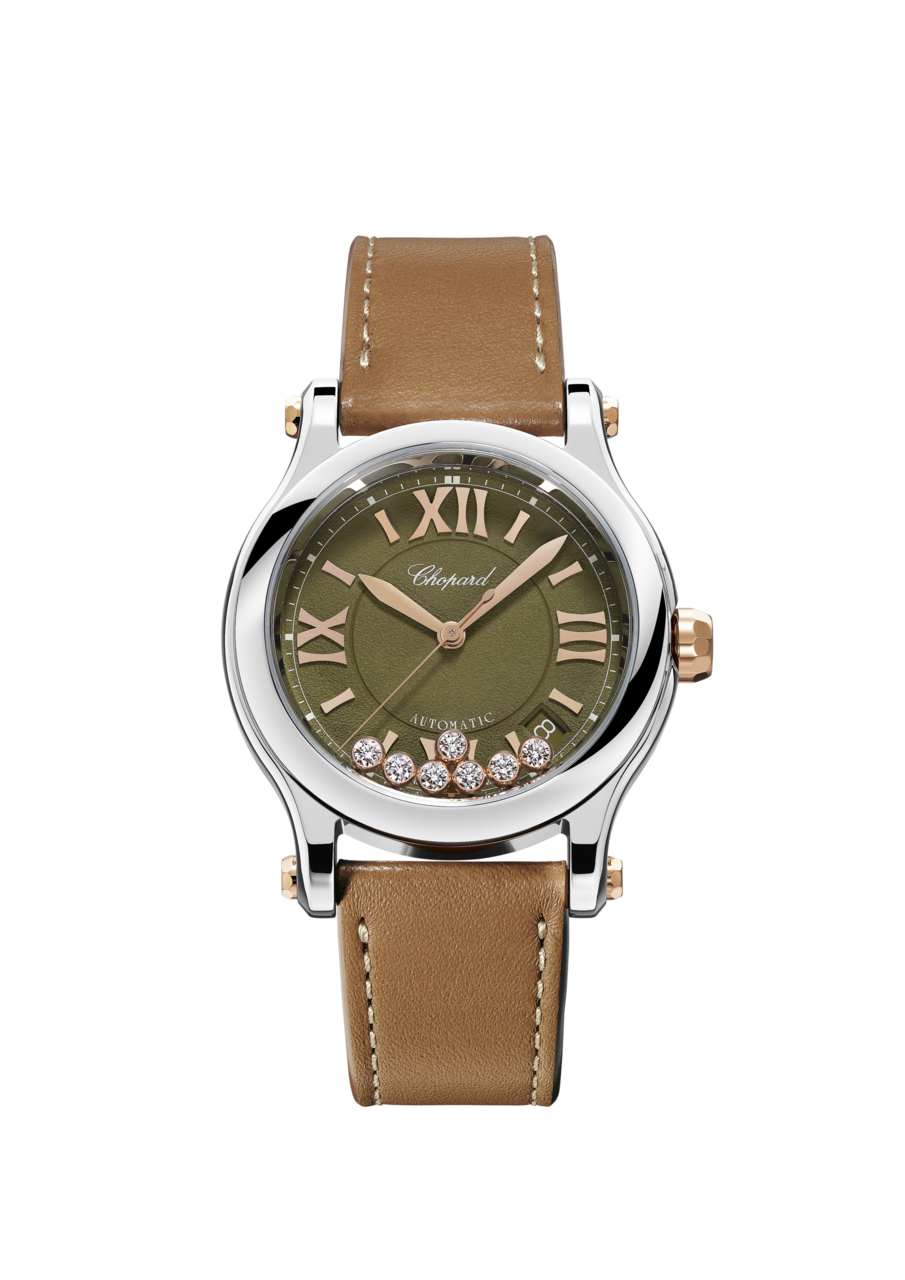 ハッピースポーツ コレクションはショパールの創造性と大胆さのシンボル。2枚のサファイアクリスタルの間を陽気に、そして自由に舞うダイヤモンドは、1993年にショパールがスティールとダイヤモンドの組み合わせを提案した初のメゾンとなって以来、想像の力をかき立て続けています。小さなダイヤモンドが成しえる大きな夢
