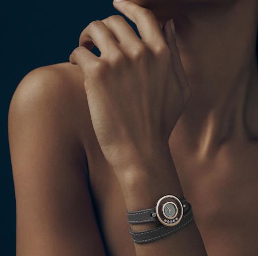 ハッピーダイヤモンド ウォッチは、自立した精神を陽気で軽やかなイメージに仕上げた最初のアイテムで、ここからコレクションは様々な形に変化を遂げていきます。2枚の透明なサファイアクリスタルの間でクルクルと揺れ動くハッピーダイヤモンドは、ダイヤモンドが素肌に直接触れているかのような印象をもたらします。
