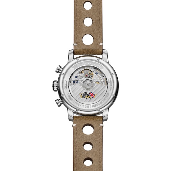 ショパールは、「ミッレ ミリア クラシック クロノグラフ トリビュート トゥ サー・スターリング・モス」を通じて、モータースポーツ史に残る偉業を称えます。直径40.5mmのルーセントスティール™製ケースに、精妙なクロノグラフムーブメントを搭載したこの限定エディションは、1955年にスターリング・モス卿がミッレミリアにおいて伝説的勝利を収めてから70周年を記念して、世界限定70本で展開されます。1955年5月1日、スターリング・モス卿とデニス・ジェンキンソンのペアは、過酷な1000マイルのレースを10時間7分48秒で完走し、平均時速157.65kmという驚異的な記録を樹立。この記録は、現在も破られていません。