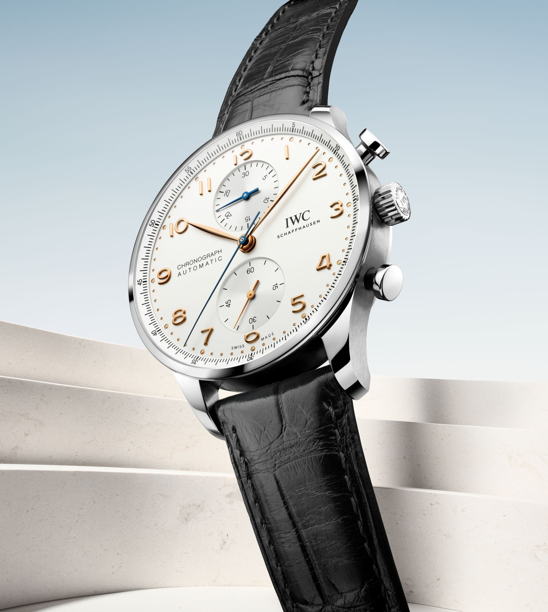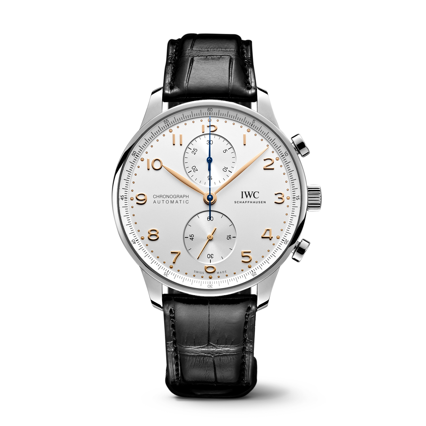 精密な目盛りを周囲に配し、サブダイヤルに段差を付けた文字盤は、調和の取れたデザインを特徴としています。「ポルトギーゼ・クロノグラフ」は、1998年の登場以来、コレクションで最も人気の高いモデルです。