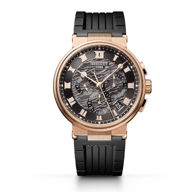 3時と9時の間には、クロノグラフ分積算計、12時間積算計、スモールセコンドの3つのカウンターが配されています。クロノグラフ秒針は、海をさりげなく想起させるデザインになっており、時間表示は、クラシックな存在感を誇るブレゲ針が指し示します。数字やインデックスには蓄光塗料があしらわれ、暗い場所でも容易に時刻を読み取ることができます。