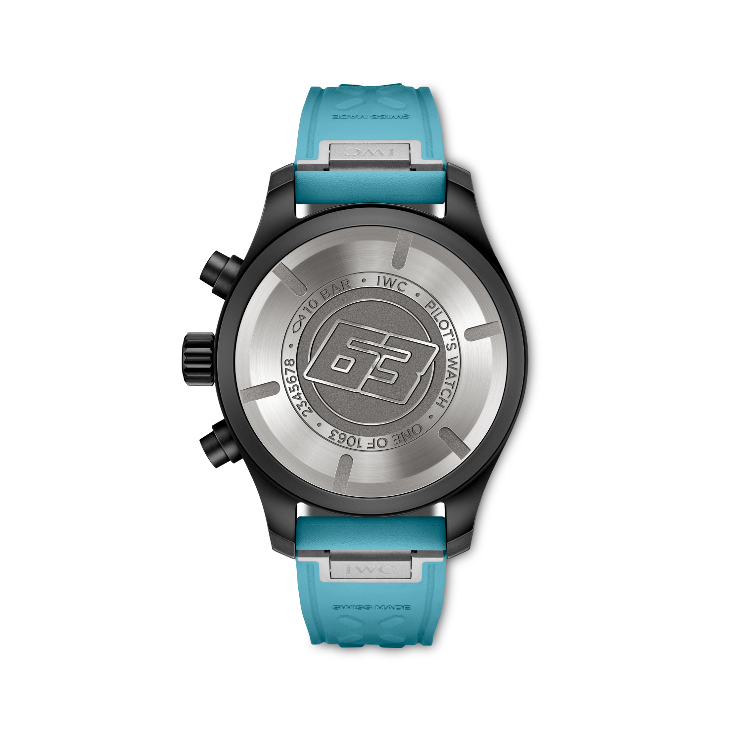 世界で1,063本限定のブラックセラミック製「パイロット・ウォッチ・クロノグラフ 41 ”ジョージ・ラッセル”」は、ドライバーのレーシングヘルメットから着想を得たユニークなブルーの文字盤プリントと、ラバーストラップを特徴としています。