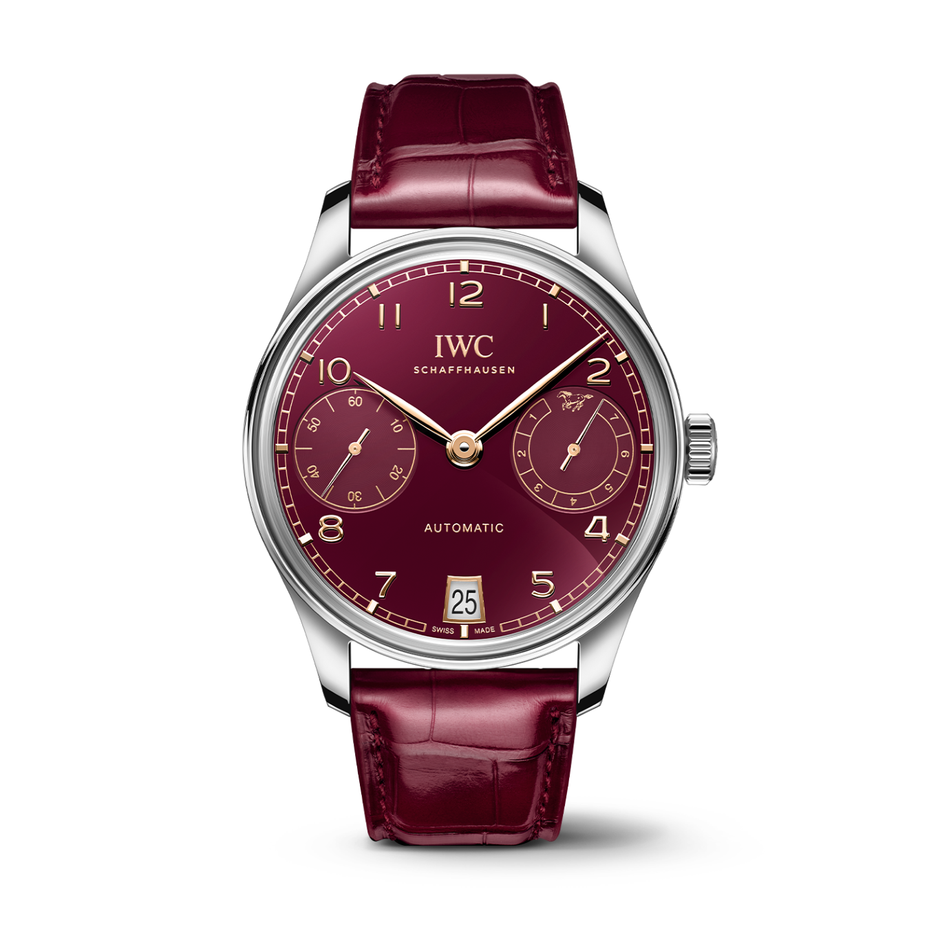 「ポルトギーゼ・オートマティック 42 “イヤー・オブ・ザ・ホース”」には、ステンレススティール製ケース、バーガンディの文字盤、そしてゴールドの針とアップライト・インデックスが採用されています。IWC自社製キャリバー52011のローター(自動巻き上げ機構の回転錘)は、駆ける馬の姿を象ったデザインで、旧正月を祝福しています。