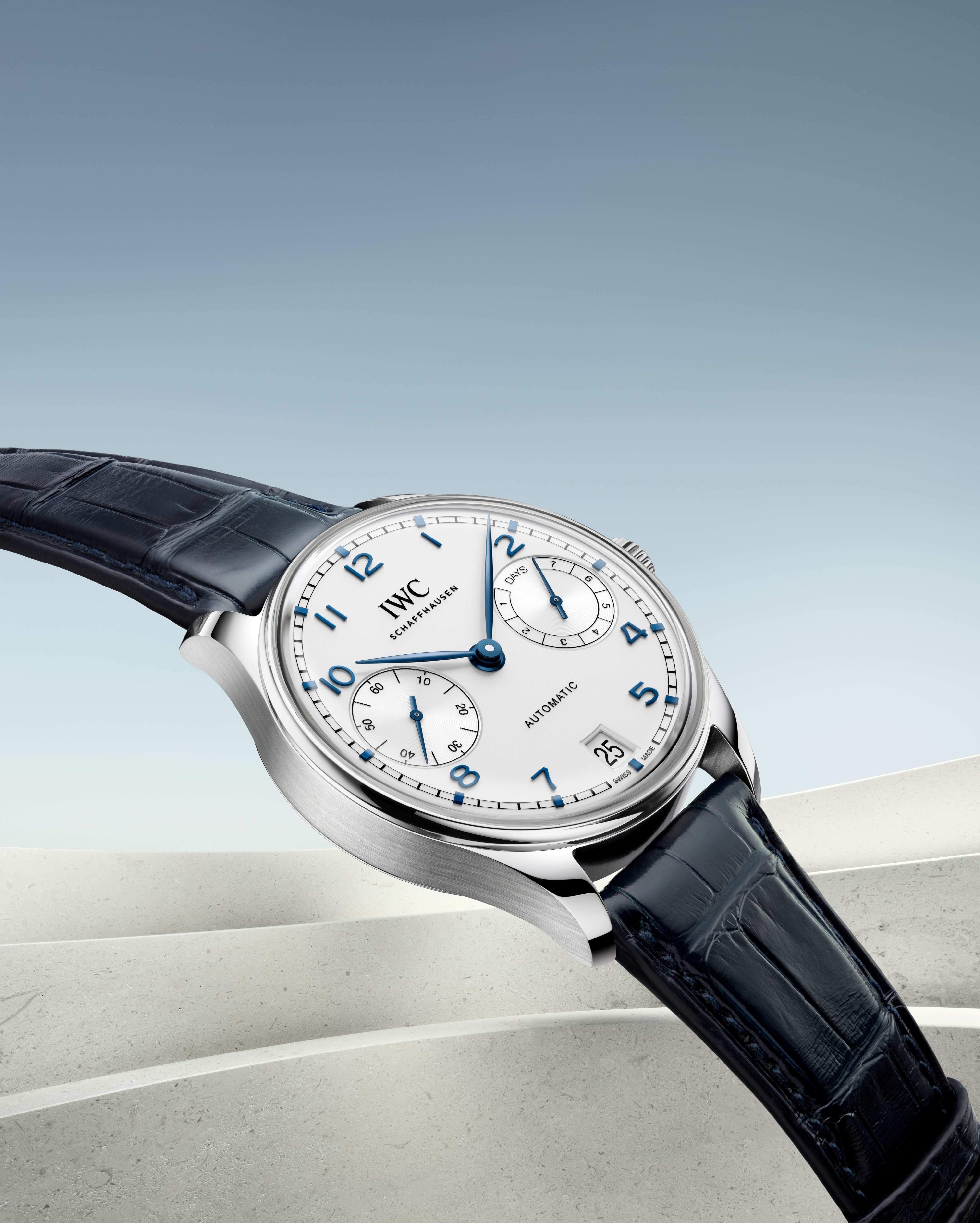 ステンレススティール製ケースの「ポルトギーゼ・オートマティック 42」。シルバーメッキの文字盤、ブルーの針とアップライト・インデックス、ブルーのアリゲーター・ストラップを備えています。