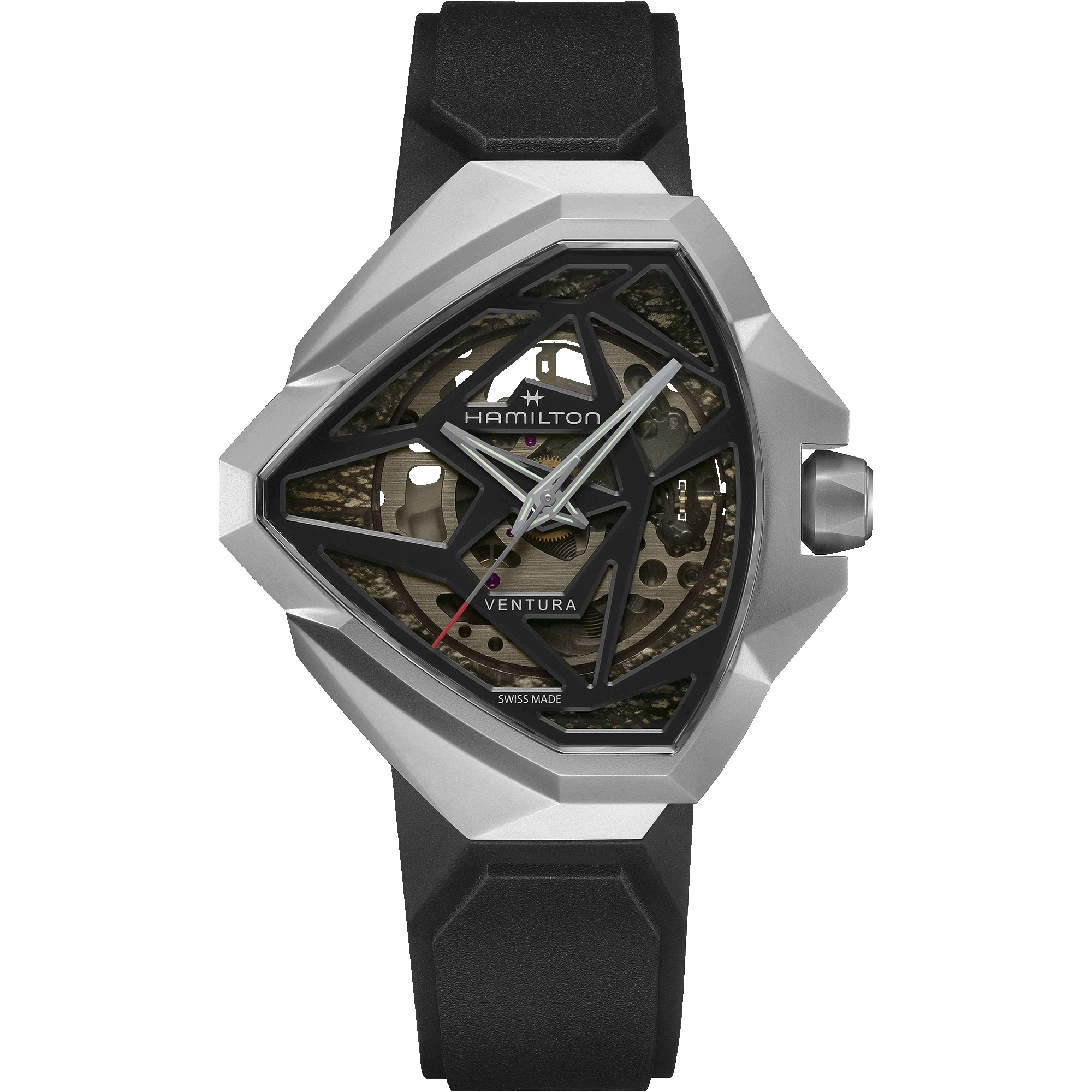 象徴的な三角形ケースを再解釈した革新的デザインは、光と影のコントラストを巧みに操り、シルバースチールのケースがドラマティックな存在感を放ちます。スケルトンダイヤルから姿を現すムーブメントH-10-Sと、ブラックラバーストラップが融合し、唯一無二のタイムピースを完成させました。
