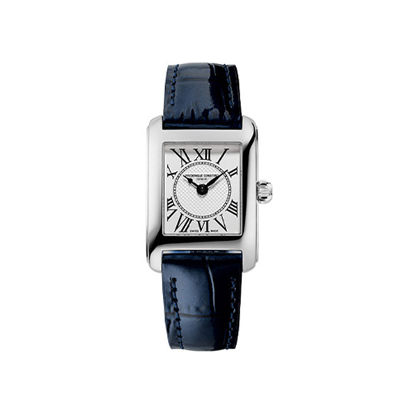 フレデリックコンスタント、カレのレディースコレクション。コンパクトな23㎜のケースに、高級感のある牛革のストラップ。ローマ数字のインデックスや、ギョーシェ装飾を施したダイヤルが特徴。動力はクォーツであり、3気圧防水も備えている。