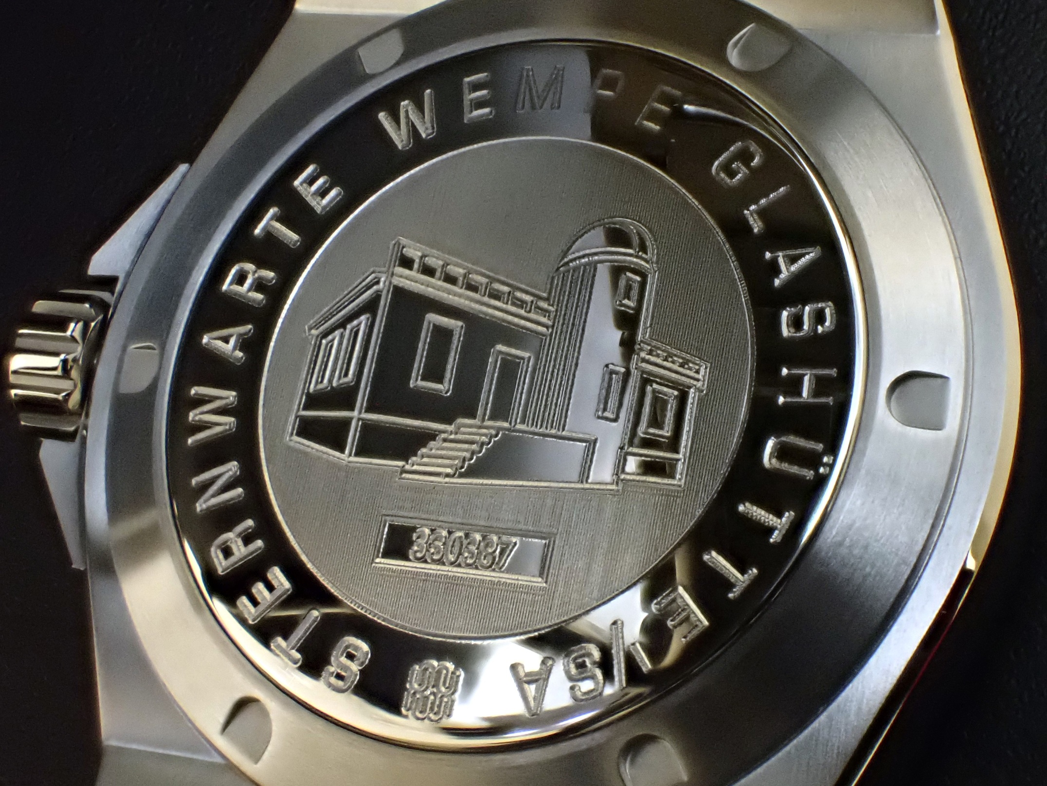 裏蓋にはヴェンペが復興し、ドイツクロノメーター検査機関となっているグラスヒュッテ天文台のレリーフ彫られています。ドイツクロノメーターとは公的機関によって、ケーシングされた状態で、ムーブメントを異なる姿勢と温度下で15日間に渡り検査し、平均日差-4秒 / +6秒以内を満たした高精度な時計に与えられる規格です。