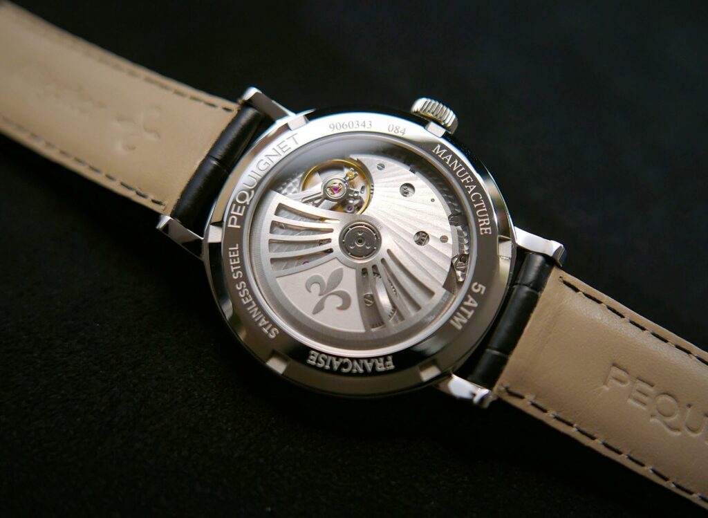 高い精度、信頼性を追求した設計で、65時間のロングパワーリザーブやセミインスタント式のデイト表示、両方向巻き上げローターなど、実用性を兼ね備えながらもコンパクトで美しい構造を実現しています。このムーヴメント(カリブル イニシャル)は、「フランス時計文化の再興」を掲げるペキニエの信念を体現した“まさに心臓部。そしてシースルーバックからは、コリマソナージュ装飾が施されたムーヴメントと、ヴェルサイユ宮殿の噴水をモチーフとした「フォンテーヌ・ロワイヤル・ローター」の美しい動きを鑑賞することができます。