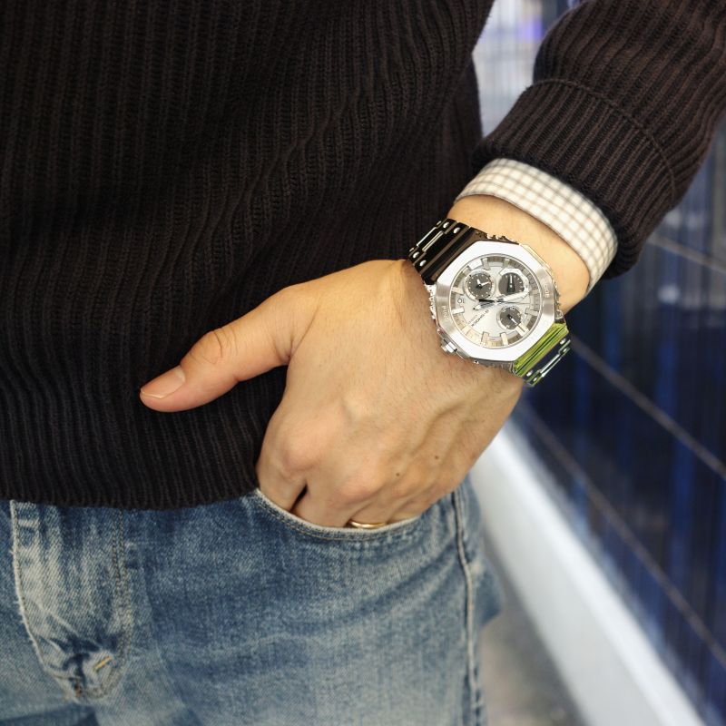 G-SHOCK初代モデル“DW-5000C”の八角形フォルムを受け継ぐGMC-B2100から、シルバーメタリックの蒸着ダイアルにブラックのインダイアルを配した、モノトーンのスポーティな表情を際立たせたモデルが登場しました。