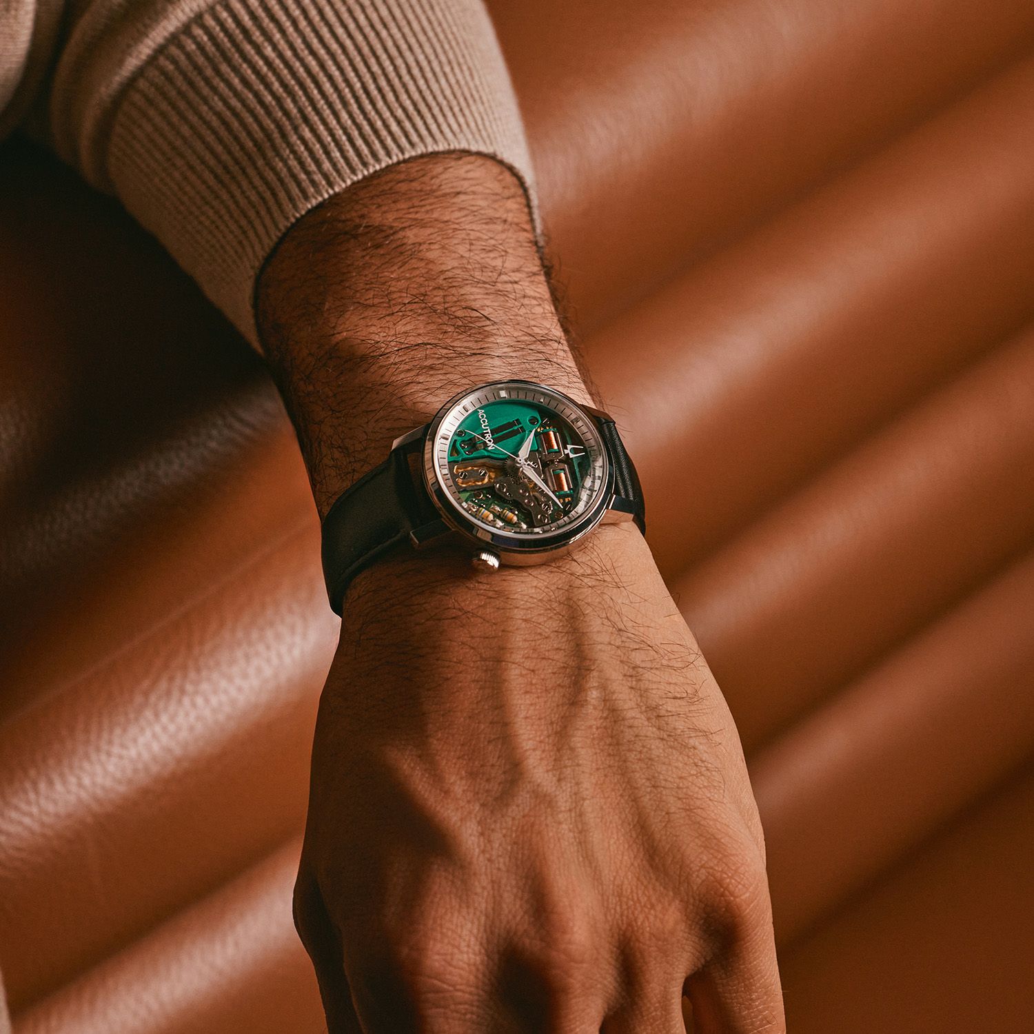 さらに、かつて存在しなかったシースルーケースバックを採用し、音叉のコイルや装飾の細部まで余すことなく眺めて楽しむことができます。