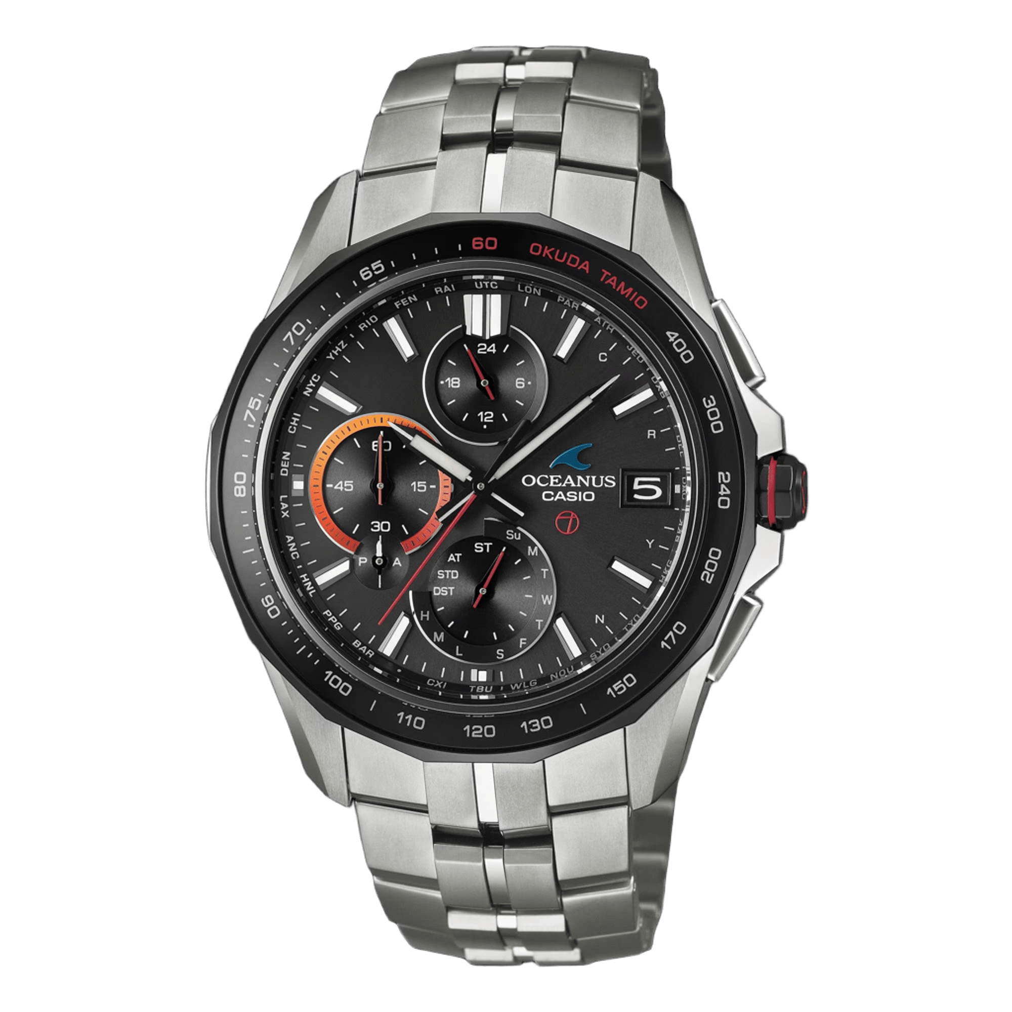 サファイアガラスベゼルのタキメーターには「OKUDA TAMIO」の文字と生誕60周年を祝い「60」の文字を赤色にした特別仕様。9時側のインダイアルリングは、自身の好きな色であるオレンジと赤のグラデーションデザインを採用しています。