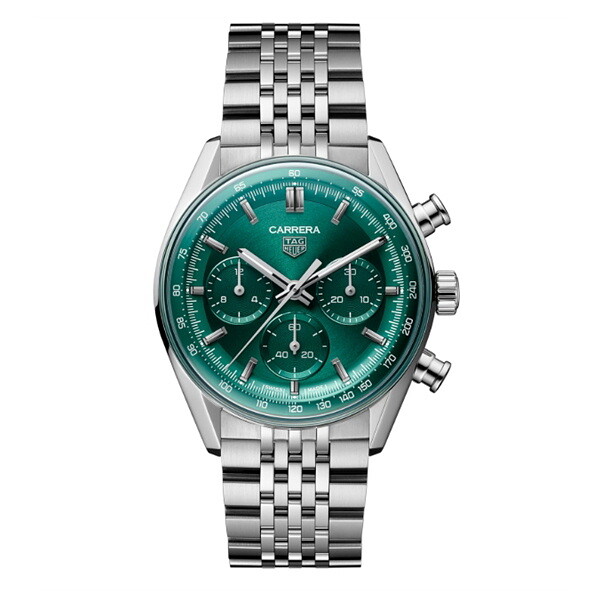 洗練されたデザインとハイパフォーマンスを兼ね備え、エレガントでありながら力強い存在感を放つ41mmのタグ・ホイヤー カレラ クロノグラフ。サーキュラーサテン仕上げを施したグリーンダイヤルが現代的なスタイルならではの魅力を放ち、約80時間のパワーリザーブを誇る自社製自動巻キャリバーTH20-01が、高い精度と耐久性を約束します。