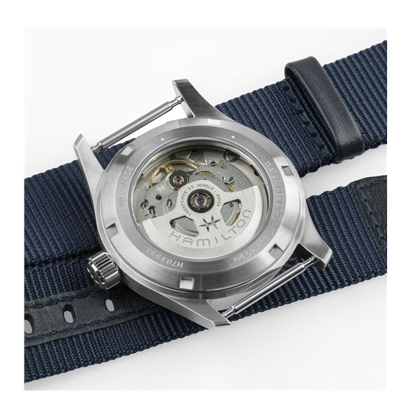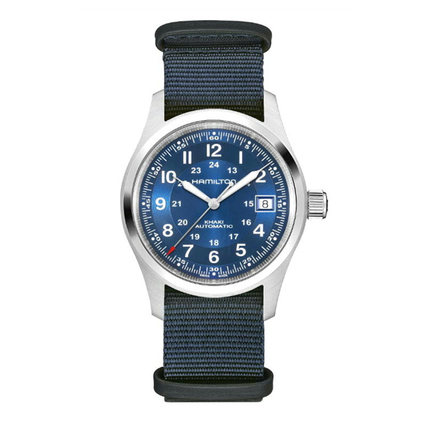 1960年代のオリジナルモデルを忠実に再現した「カーキ フィールド オート」は、標準持続時間80時間を実現するアイコニックなH-10自動巻きムーブメントを搭載しています。ミリタリーのルーツにインスパイアされたこのラギッドなスイス製タイムピースは、ステンレススチール製ケース、ブルーダイヤル、薄暗い中でも視認性を確保するスーパールミノバ®加工の針を備えています。耐久性に優れたブルーNATOストラップがミリタリーな印象を強調し、あらゆるシーンで活躍する準備が整っています。