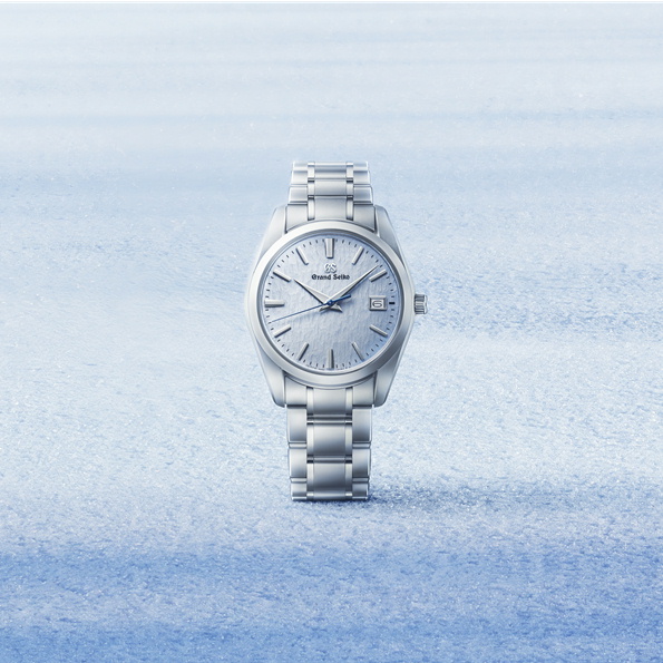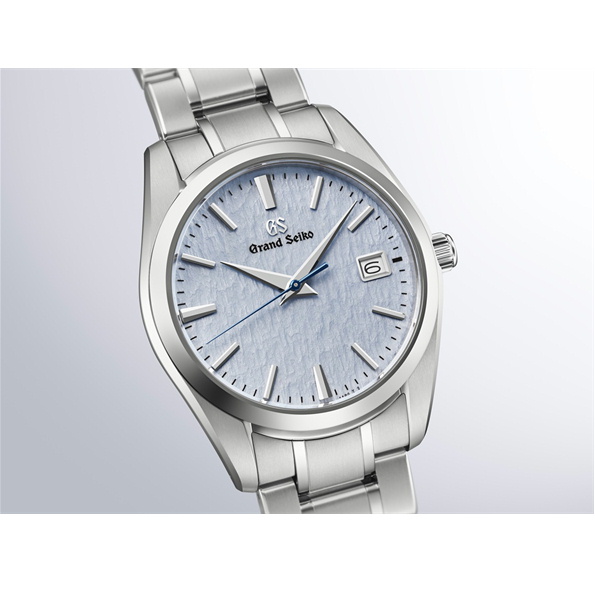 風紋が刻まれた雪のような独特なダイヤル模様は、信州の山々に積もった雪から着想を得たものです。この繊細な質感のダイヤルに、澄んだライトブルーのカラーリングを施しました。雪原を思わせるパターンと、清らかな水色のコントラストが、腕元にさりげない個性と洗練をもたらします。グランドセイコー専用の年差クオーツムーブメント「キャリバー9F62」を搭載し、37mmサイズのケースに仕上げました。ケースとブレスレットには、ステンレススチールと比べて約30%軽量で、耐傷性・耐食性に優れるブライトチタンを採用することで、軽くて心地よい装着感を実現しました。