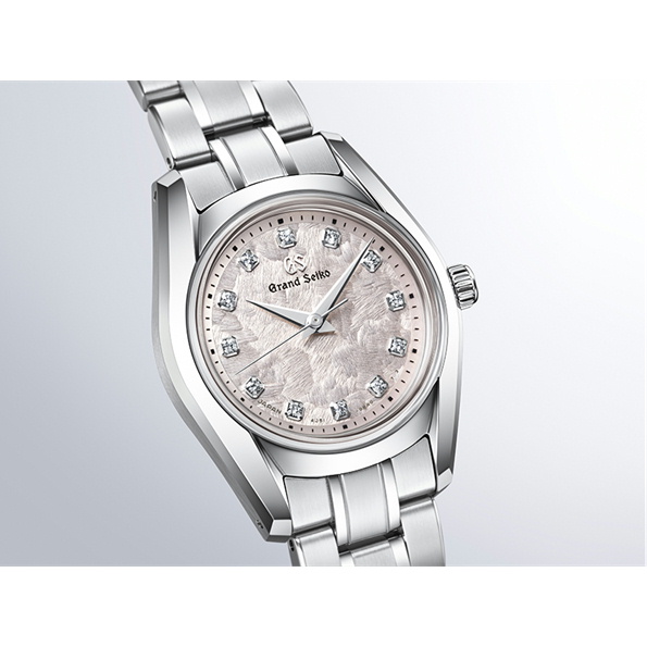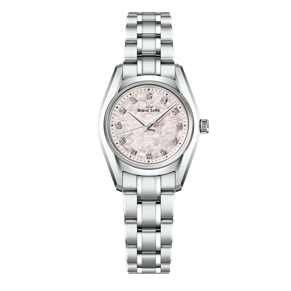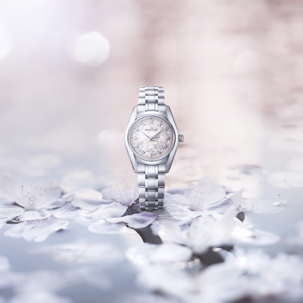「62GS」の中でも高い支持を得ている「花筏(はないかだ)」に、26mmスモールサイズのクオーツモデルが加わりました。1967年発売のグランドセイコー史上初の自動巻機械式モデル「62GS」を現代的にアレンジした「62GS現代デザインモデル」をベースとし、日本特有の季節の移ろいをダイヤルで表現したモデルです。ベゼル(ガラス縁)のない構造によって広々と見えるダイヤルや、ザラツ研磨によって実現したシャープな多面体からなるケースが魅力です。ダイヤルは、風に舞い散った桜の花びらが川の水面を覆う「花筏」の情景を表現しています。ケースデザインは、小さいながらも高い視認性を確保。シンメトリーに配したダイヤモンドが生み出す、華やかで心地よいダイヤルに仕上げました。ムーブメントは、年差±10秒のクオーツ「キャリバー4J51」を採用しています。
