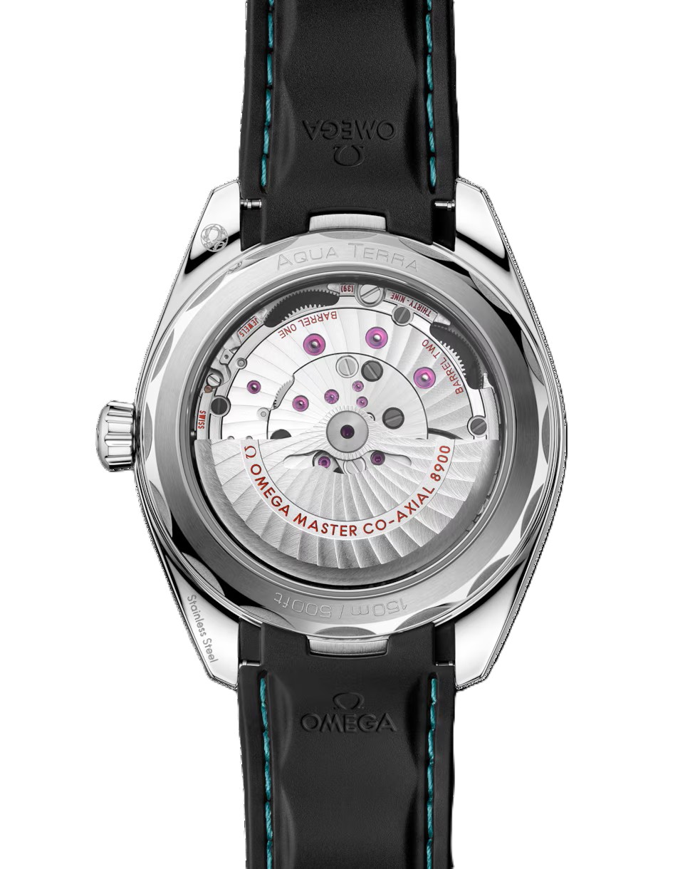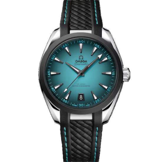 ターコイズのステッチがあしらわれたフォールディングクラスプ付き一体型ブラックラバーストラップが合わせられ、着け心地のよさを約束します。スイス連邦計量・認定局(METAS)認定の業界最高水準を誇るオメガ コーアクシャルマスター クロノメーター キャリバー8900搭載。