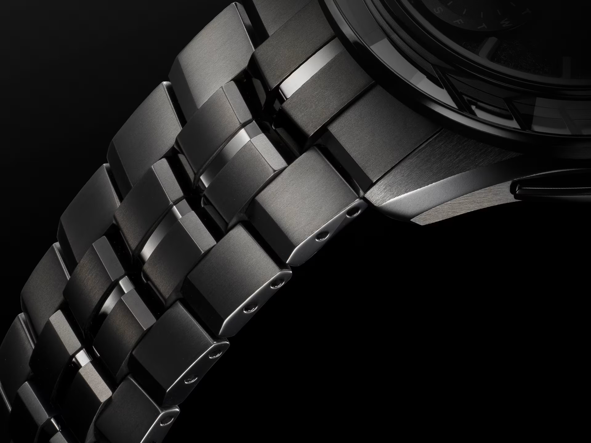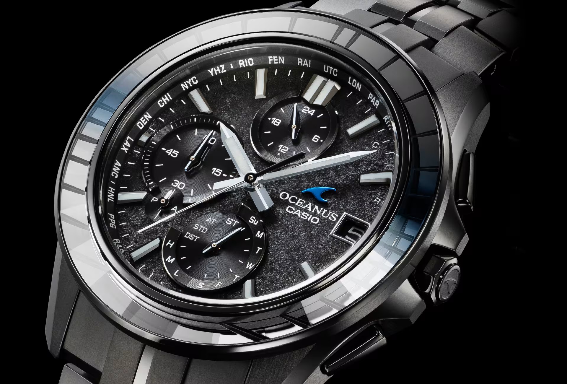 上質な仕上げと薄く美しいフォルムを追求しているOCEANUS Mantaライン。 OCW-S7000CN-1Aは、OCEANUSが誇るものづくりの技術と日本の伝統技法が美しく融合したモデルです。上下で異なるカッティングラインが美しいサファイアガラスベゼルが特徴で、江戸切子の職人が一つひとつ手作業でカットを施して仕上げています。 デザインテーマは「CALM NIGHT」。 月の光に照らされた夜の海を、オールブラックのチタン外装と江戸切子のサファイアガラスベゼルで表現しました。硬いサファイアガラスに幅、深さを均一に切り込みを入れ、江戸切子にしか表現できない煌めきとシャープな美しさが魅力です。 深みと輝きを生み出すシルバーとブラックのグラデーションカラーは、どこまでも続くような海の広大さを表現。光の加減でブルーカラーに偏光し本物の海を思わせます。 また、月面の凹凸や陰影をモチーフにしたテクスチャーダイアルを採用。マットな質感で、月面の繊細かつ優美な表情を表現しました。