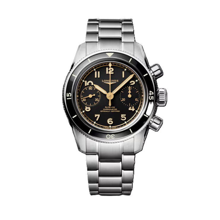 「ロンジン スピリット パイロット フライバック」コレクションは、ロンジンの絶え間ない革新への情熱を表現しています。フライバック機能を搭載したクロノグラフは、この分野におけるロンジンの先駆的な専門技術が生きています。翼を持つ砂時計をブランドロゴとするロンジンは、1930年代初頭にフライバック機能を搭載した最初のモデルを発表し、1936年6月16日にはその製造技術における特許を取得するという世界初の偉業を達成しました。パイロットのための革新的ツールとして設計されたフライバック・コンプリケーションは、連続した飛行段階の計時を可能にし、航行効率を大幅に向上させました。「ロンジン スピリット パイロット フライバック」の精度の高さは、シリコン製ヒゲゼンマイを搭載し、耐磁性を備えたロンジン独自のキャリバーによって支えられています。この手巻きムーブメントは、COSCによるクロノメーター認定を取得しています。