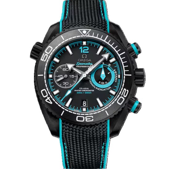 マットなセラミック製ダイアルの3時位置には、レースのスタートを計測するカウントダウン インジケーターが。レース前のプロトコルを思わせるデザインです。このインジケーターの針、そしてサブダイアルリング、ミニッツトラック、12の数字、アメリカズカップのトロフィーを象ったカウンターウェイト付きクロノグラフ秒針はすべて、ETNZロゴと同じターコイズカラーです。このカラーはまた、サテン仕上げのブラックセラミック製プッシュボタンに付いたリング、ヘリウムエスケープバルブに施された「HE」の文字、そしてリュウズにあしらわれたオメガのロゴにも使われています。