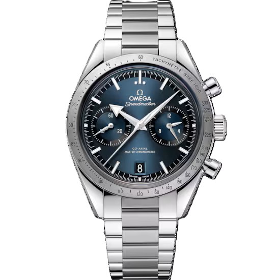 伝説的な1957年の初代スピードマスターにインスピレーションを受けた40.50mmのモデルは、ステンレススティール製ケースとブルーのダイアル、ホワイトスーパールミノヴァが塗布されたロジウムのインデックスと「ブロードアロー」の針を備えています。6時位置に日付表示、9時位置にスモールセコンド、3時位置には12時間と60分の同軸積算計のサブダイアルが配置されています。