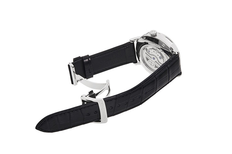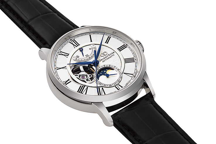 自動巻 (手巻付)、パワーリザーブ表示機能、シースルーバック、22石、月齢機能、月齢機能修正用器具付き、秒針停止装置付き