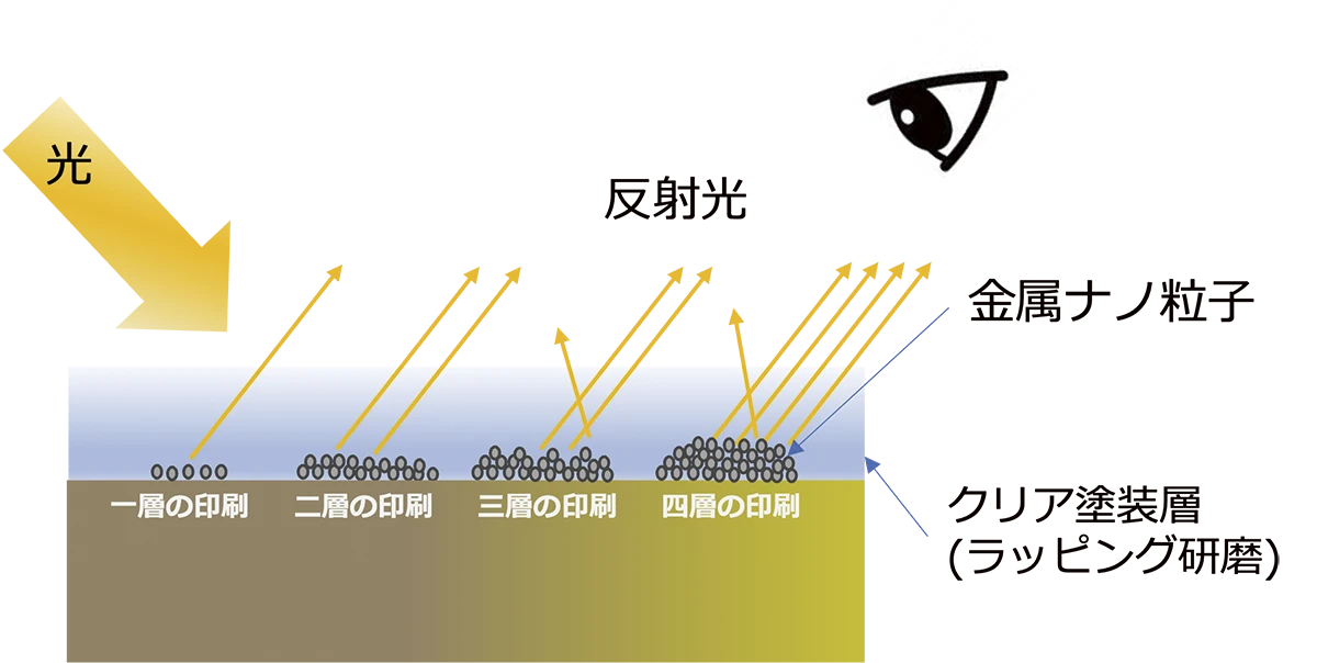 この繊細な輝きは、実は、セイコーエプソンがもともと電子部品を作るために開発した**「金属ナノ粒子積層技術」**という、世界初の特別な技術によって作られています。